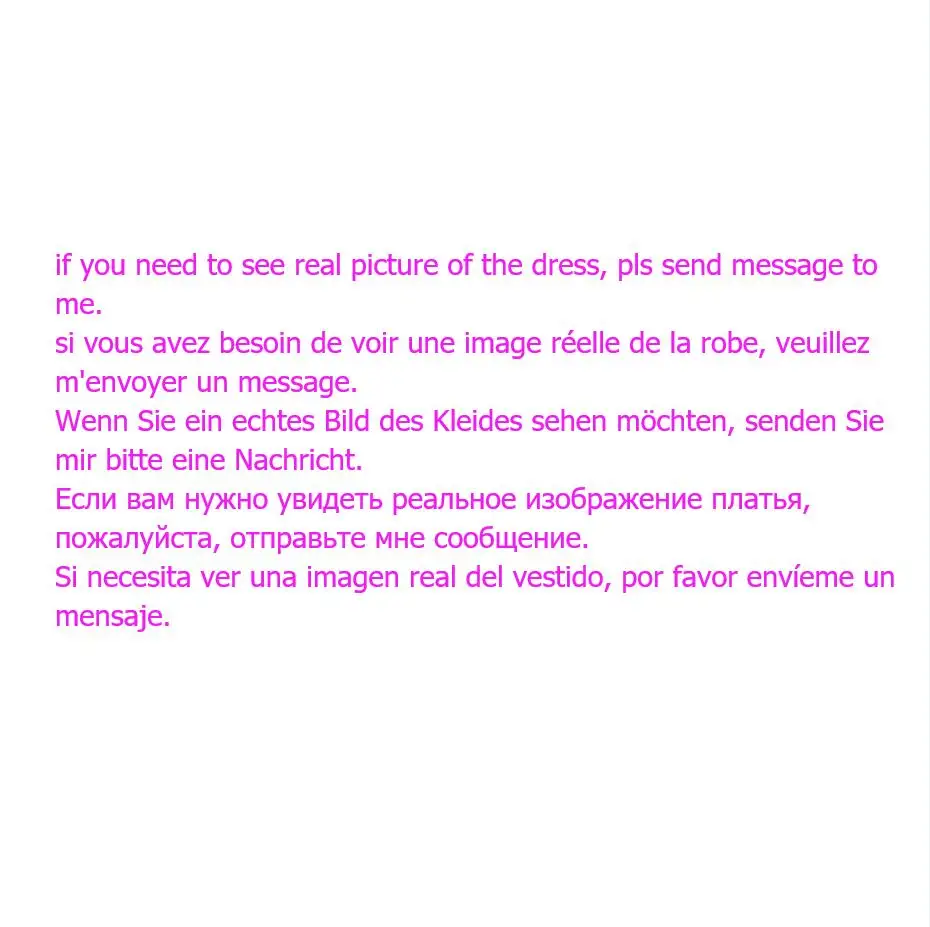 В: как сделать замеры на заказ? О: мы можем предоставить бесплатные индивидуальные услуги по измерению. Во-первых, вы можете выбрать любой размер, чтобы разместить заказ, это только для оплаты, а затем вы отправите мне свои измерения, в том числе: Обхват груди _ дюйм или _ см, Талия _ дюйм или _ см, Бедра _ дюйм или _ см, Ваш рост (с обувью) _ дюйм или _ см. Длина руки _ дюйм или _ см В: как сделать заказ цвета? О: мы можем предоставить бесплатные индивидуальные услуги по цвету. Вы можете выбрать цвет на основе карты, или вы можете связаться с нами. В: как сделать платья на заказ? О: вы можете отправить мне изображение платья, тогда я дам вам хорошую цену, если вы можете принять, мы отправим вам ссылку для оплаты. В: время производства и время доставки О: Обычно наше время производства составляет 5-7 дней, ускоренный заказ 3-5 дней. Когда вы размещаете заказ, вы можете посмотреть общее время доставки. В: Могу ли я изменить некоторые оригинальные дизайны платьев? О: без проблем, это бесплатно. Вопрос: Что делать, если мне не нравятся эти платья? О: Прежде всего, пожалуйста, не волнуйтесь, вам нужно связаться с нами, мы можем помочь вам решить эту проблему.