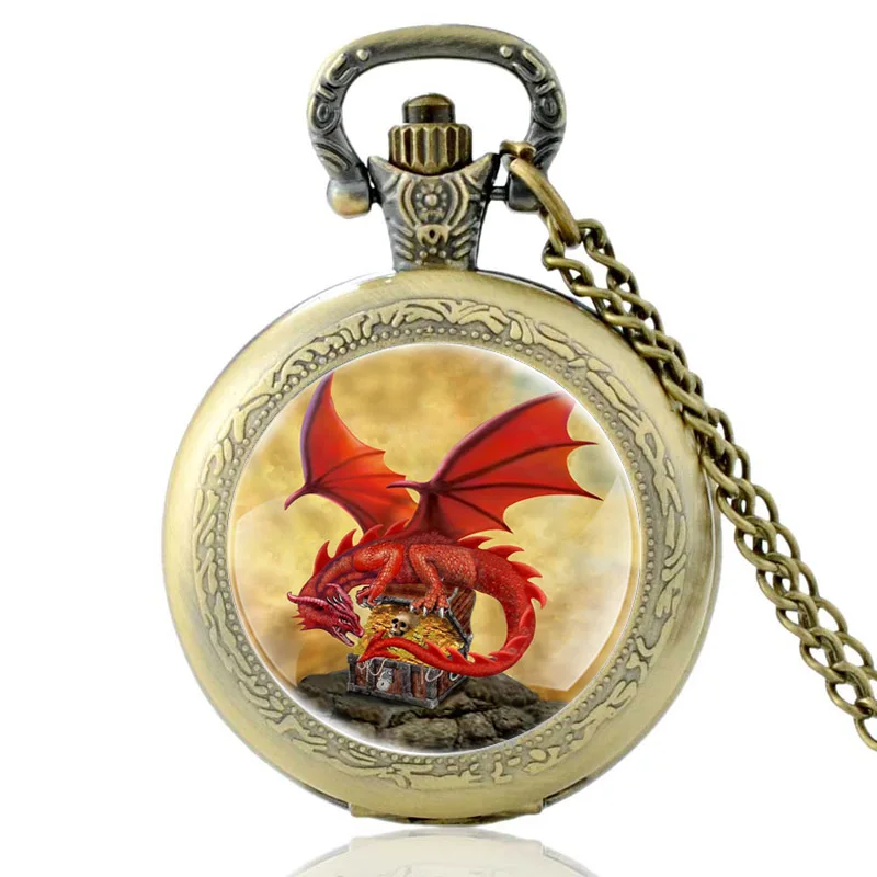 Красный дракон, защитник сокровищ, нагрудный дизайн, винтажные кварцевые карманные часы для мужчин и женщин, подвеска-брелок, ожерелье, часы