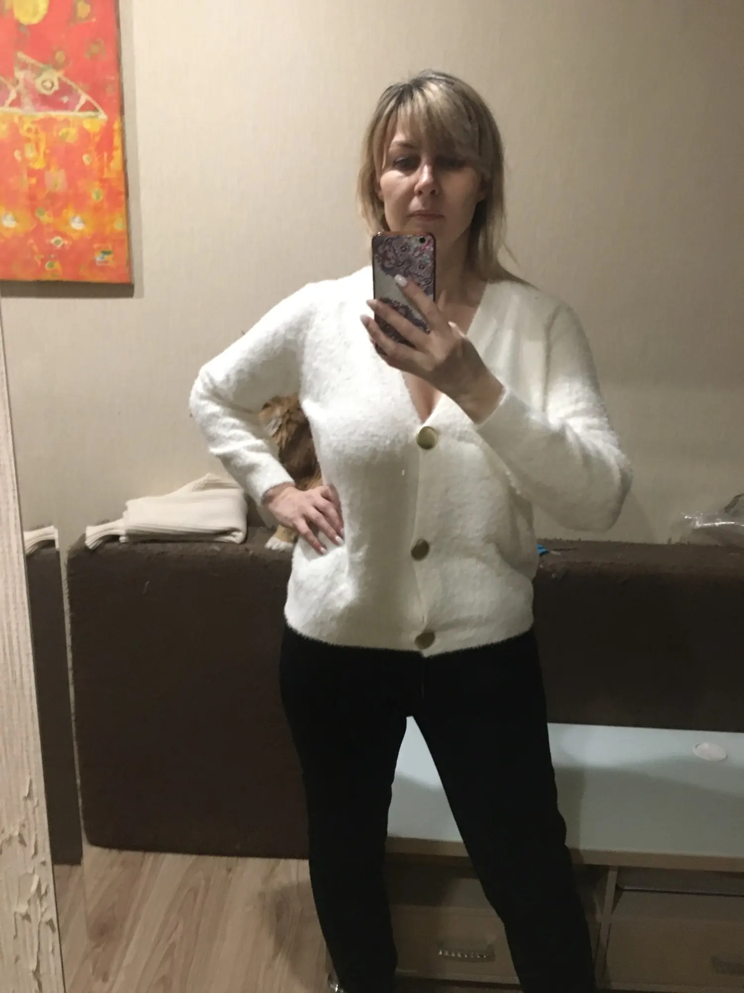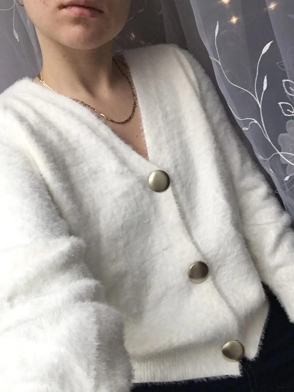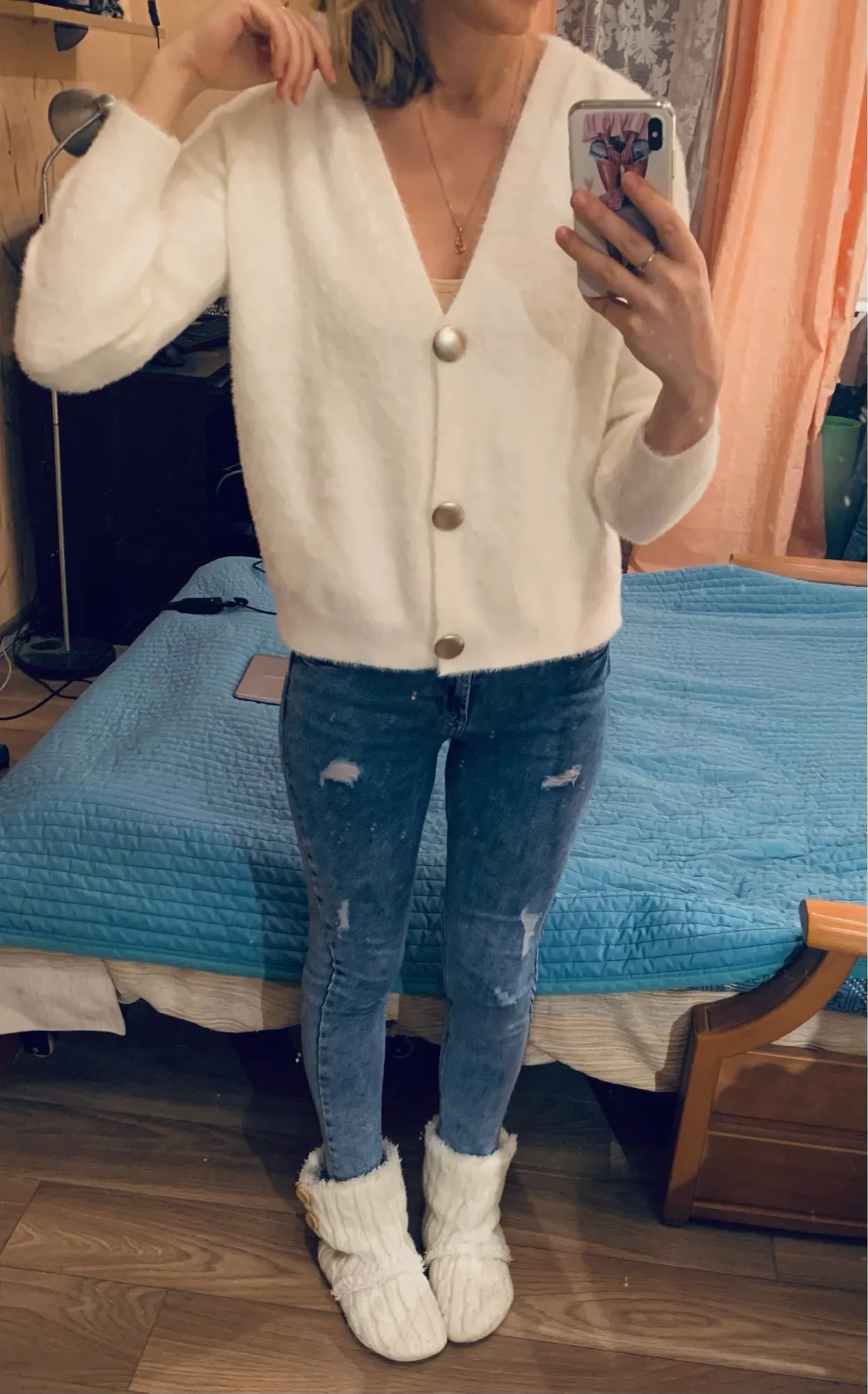 Кооофта проооосто бомбическая!!! Во-первых, это материал и вязка, эна очень качественная, материал такой приятно тяжеленький, растягивать я не будет, точно. Этот милейший ворс, как шёрстка! По крайней мере, в белом варианте смотрится ну очень хорошо! Цвет не белый, а айвори или же слоновая кость, красииивый! Рукав у манжета немного расширен, на худых руках будет вообще круто смотреться! Пуговицы тоже очень хорошо смотрятся, но я буду искать такие же без ножки, т.к. в расстегнутом варианте они висят и это начинает смотреться небрежно. На мой М село хорошо, не в облипку, но не так свободно, как хотелось и должно. Всхуднуть и будет вообще огонь! Короче, кофта огонь, рекомендую, состоится очень прилично, дорого, крой хороший, все фото прилагаю❤️