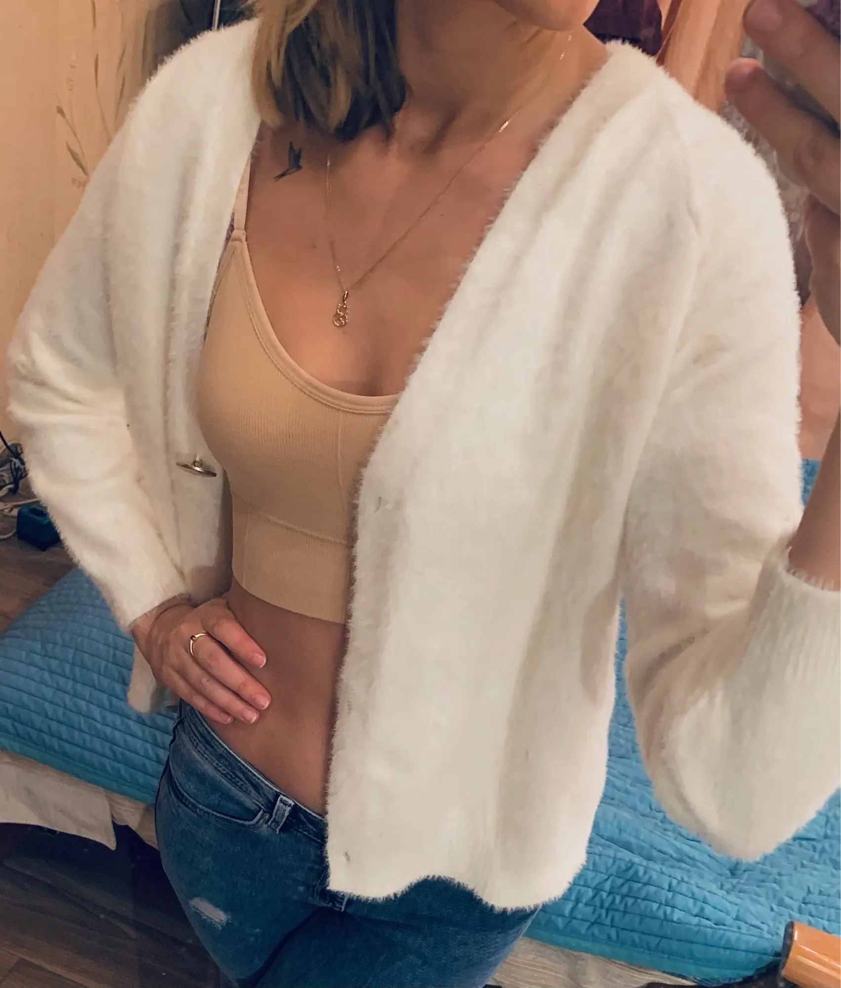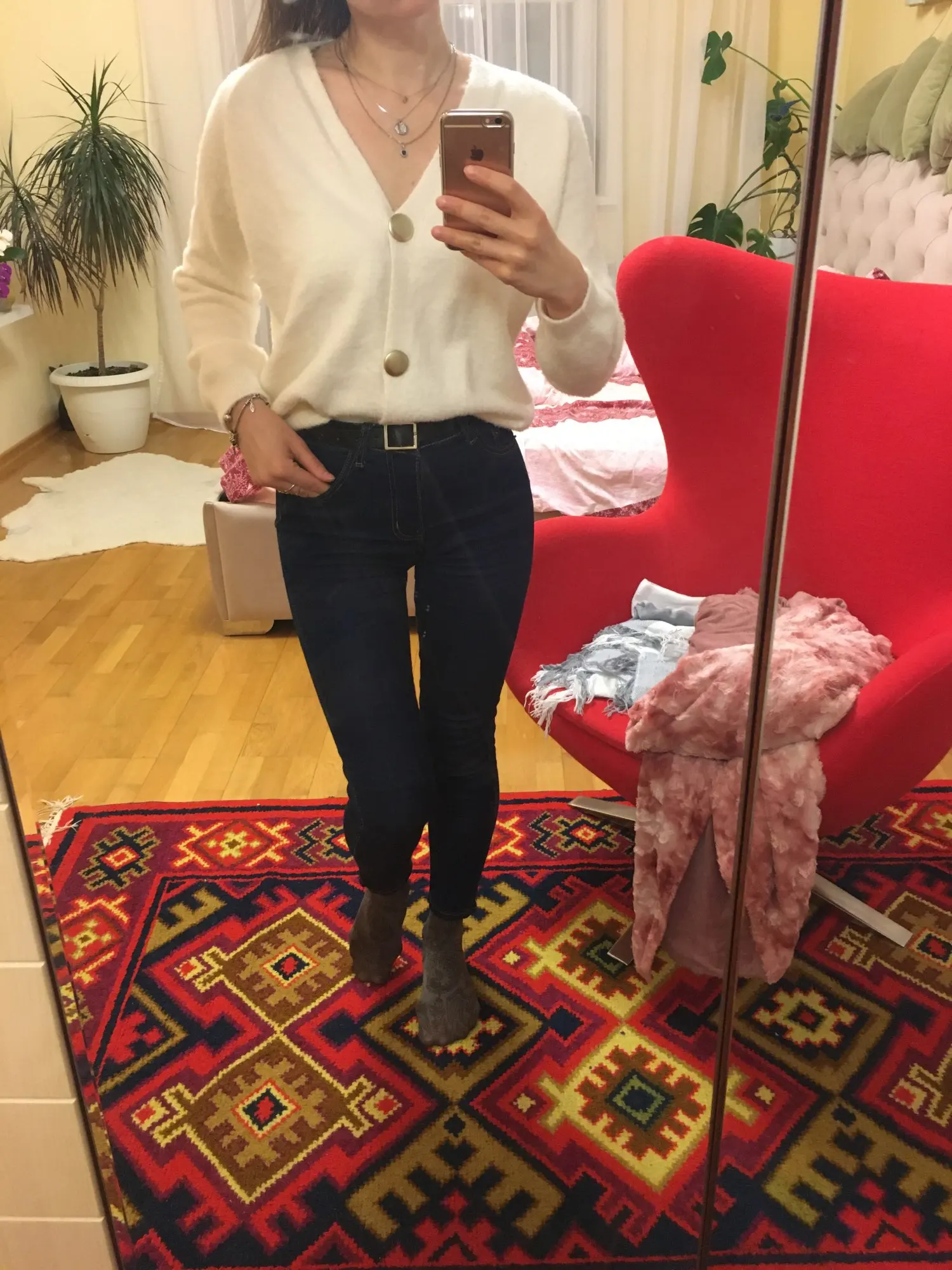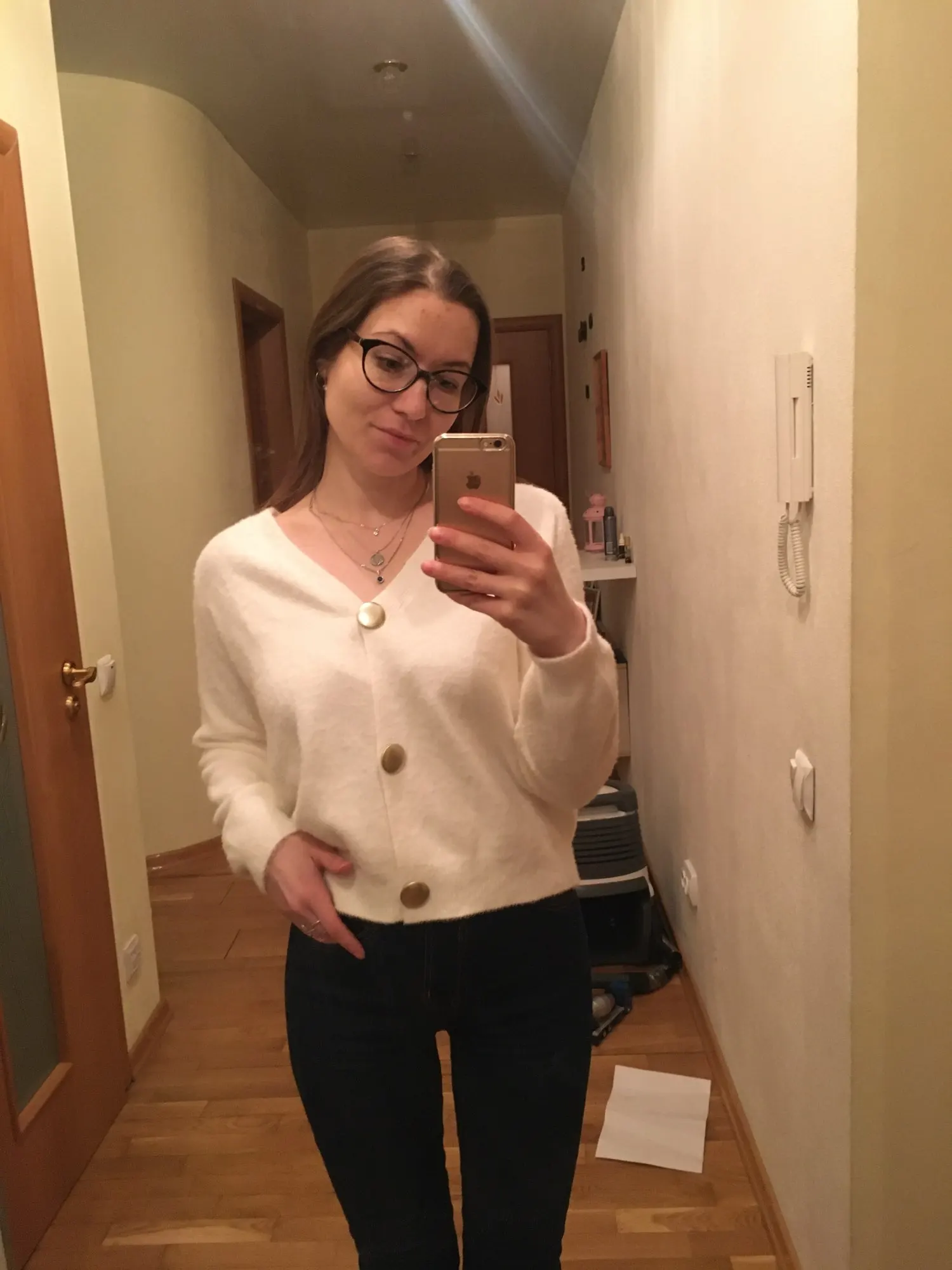 Кооофта проооосто бомбическая!!! Во-первых, это материал и вязка, эна очень качественная, материал такой приятно тяжеленький, растягивать я не будет, точно. Этот милейший ворс, как шёрстка! По крайней мере, в белом варианте смотрится ну очень хорошо! Цвет не белый, а айвори или же слоновая кость, красииивый! Рукав у манжета немного расширен, на худых руках будет вообще круто смотреться! Пуговицы тоже очень хорошо смотрятся, но я буду искать такие же без ножки, т.к. в расстегнутом варианте они висят и это начинает смотреться небрежно. На мой М село хорошо, не в облипку, но не так свободно, как хотелось и должно. Всхуднуть и будет вообще огонь! Короче, кофта огонь, рекомендую, состоится очень прилично, дорого, крой хороший, все фото прилагаю❤️