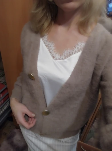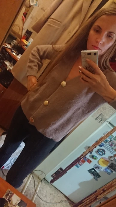 Потрясающая кофта. Очень мягкая, нежная, постоянно хочется ее гладить)) на мои параметры 86-68-90/160 размер сел идеально. Рукава 7/8. В ней тепло и комфортно. Пуговицы очень стильно выглядят. Я очень довольна покупкой. У меня в Телеграм/Инстаграм lazycrazymom много крутых подборок с алиэкспресс