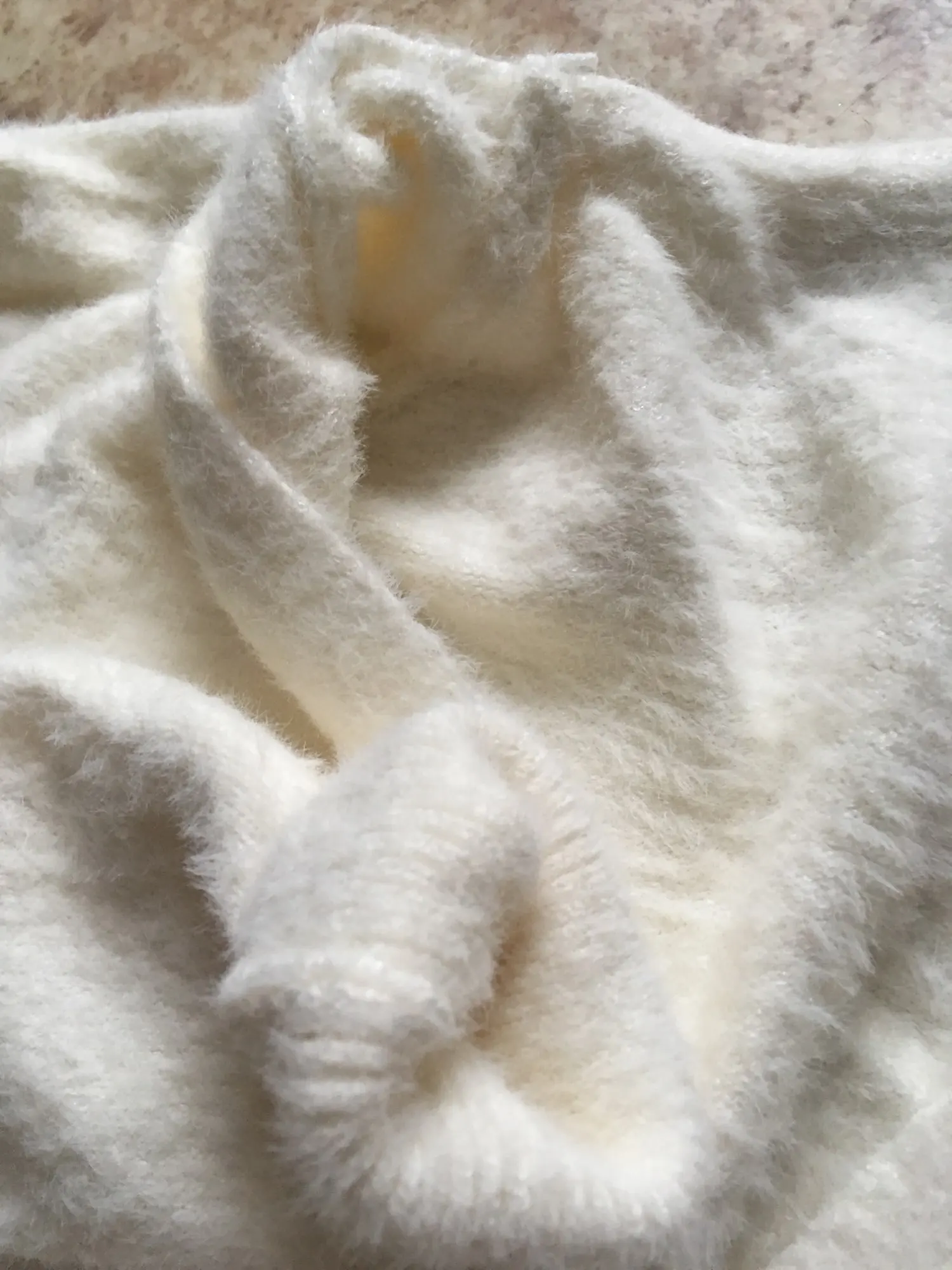 Кофта менее пушистая, чем на фото, но приятная, мягкая. Внизу нет резинки, мне показалась широкой, думаю вшить туда резинку. Доставка быстрая.