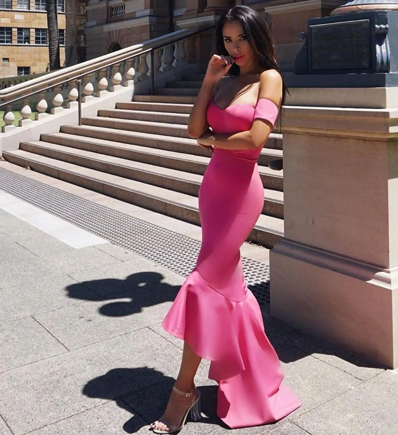 Платье вечернее Персиковое розовое с юбкой годе, открытыми плечами и коротким рукавом