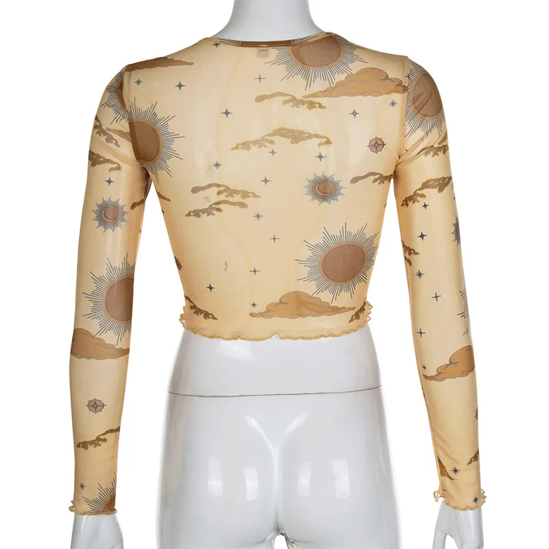 Футболка женская прозрачная сетчатая, с длинным рукавом и принтом, ...