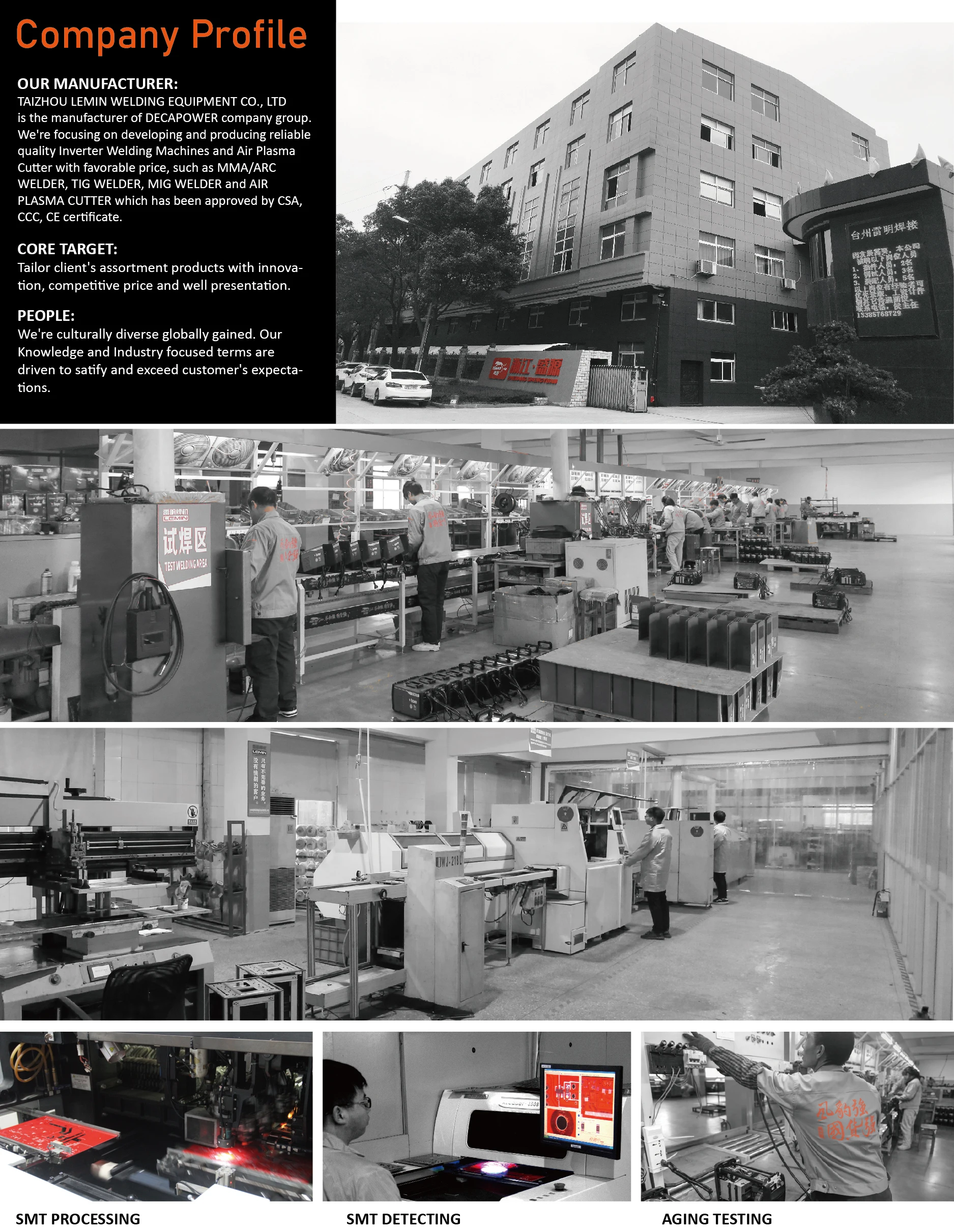 Сварочное оборудование TAIZHOU LEMIN CO., LTD является производителем группы компаний DECAPOWER. Мы специализируемся на разработке и производстве надежных качественных инверторных сварочных аппаратов и воздушных плазменных резаков по выгодной цене, таких как MMA/ARC сварочный аппарат, TIG сварочный аппарат, сварочный аппарат MIG и воздушный плазменный резак, одобренный сертификатами CSA, CCC, CE.