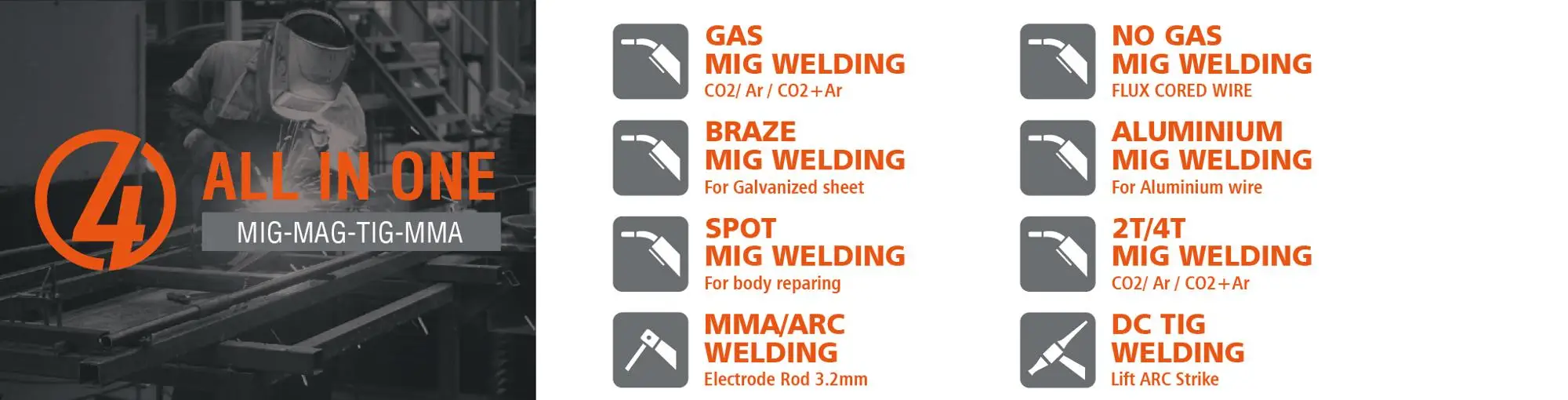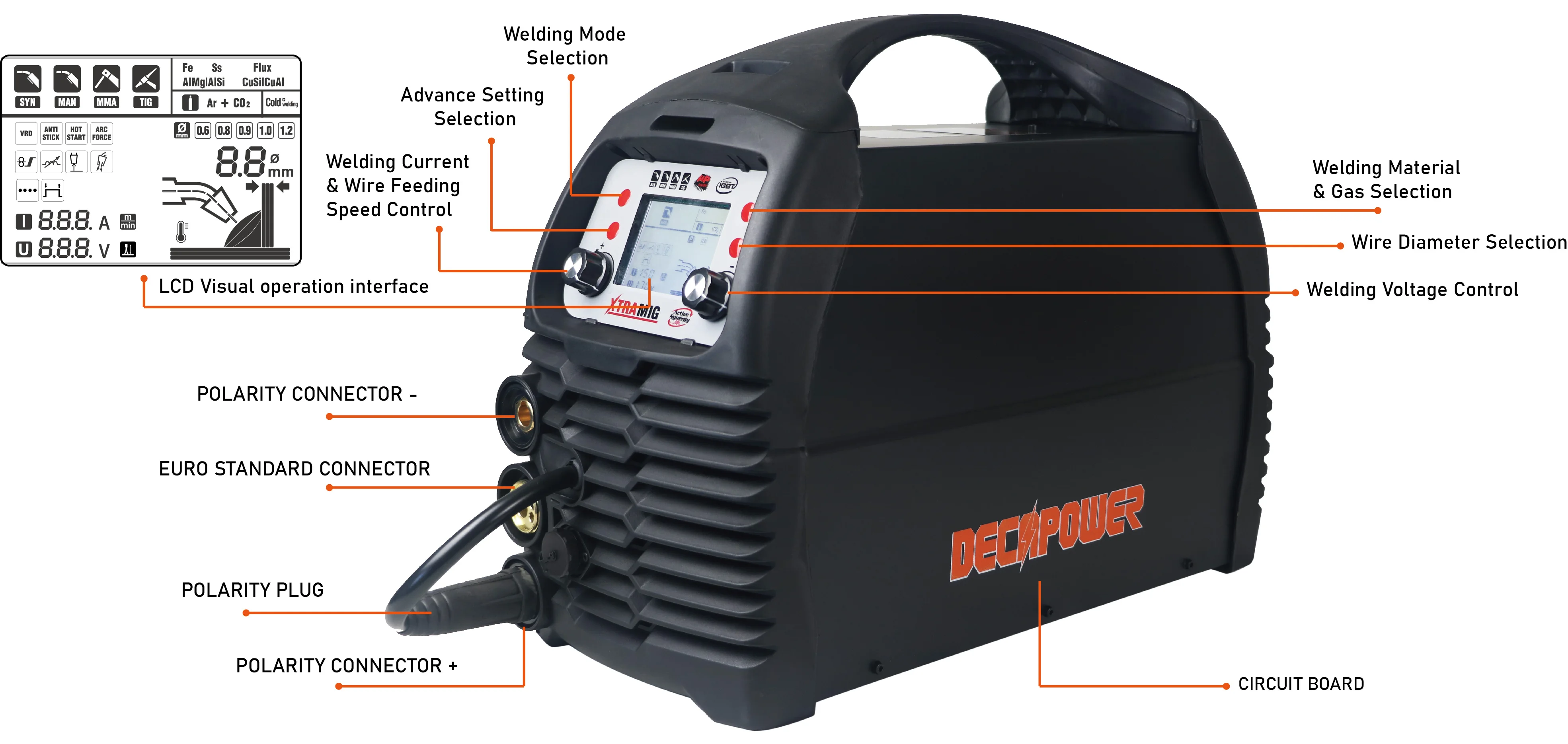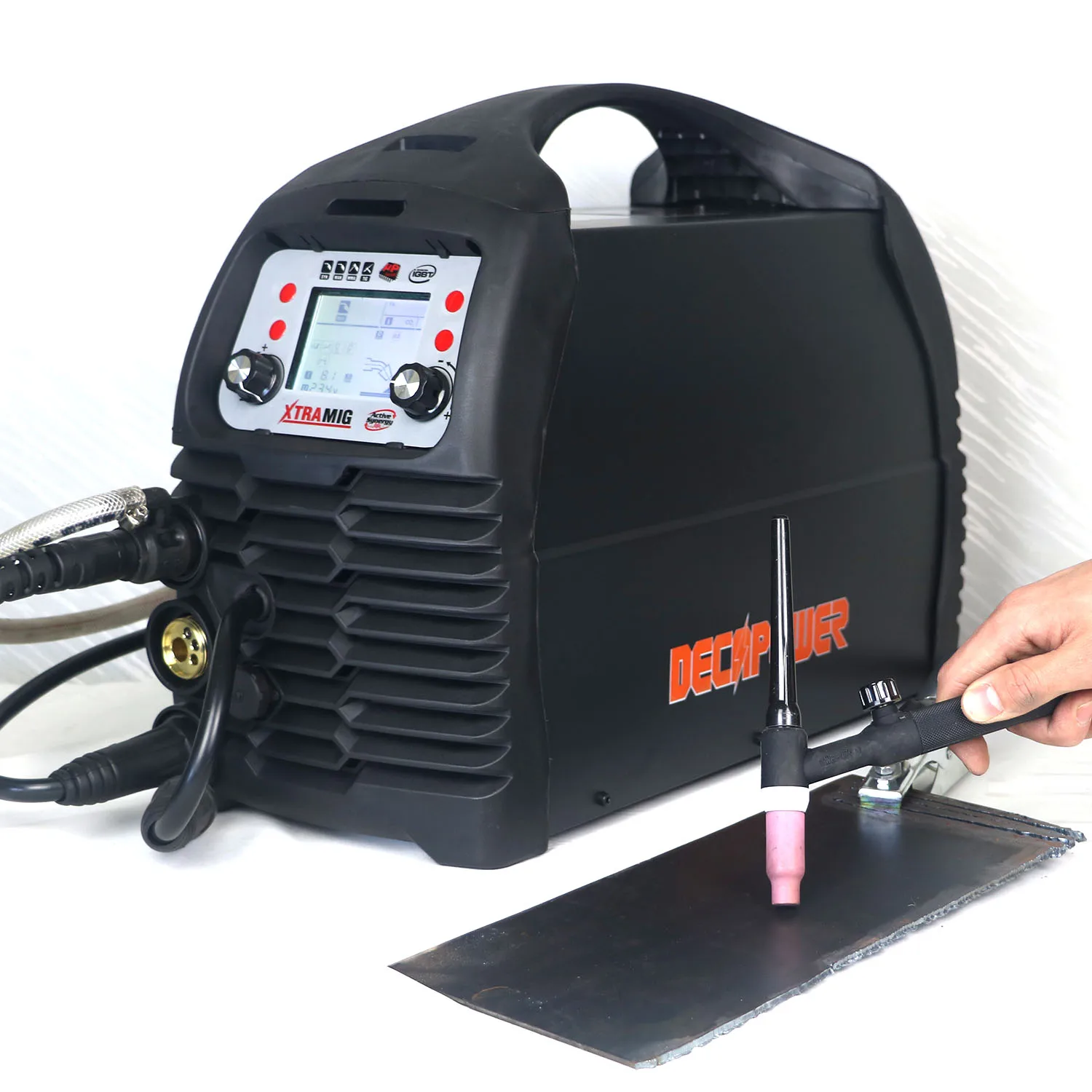 Новейший многофункциональный инверторный Сварочный аппарат DECAPOWER серии Synergy с микропроцессором может полностью удовлетворить ваши потребности! Все в одном: газовая сварка MIG/MAG, сварка проводов без газового потока, пайка MIG, сварка алюминиевой проволоки, сварка медной проволоки, сварка проволоки из нержавеющей стали 2T/4T сварка, дуговой палочкой сварка, DC lift TIG сварка.