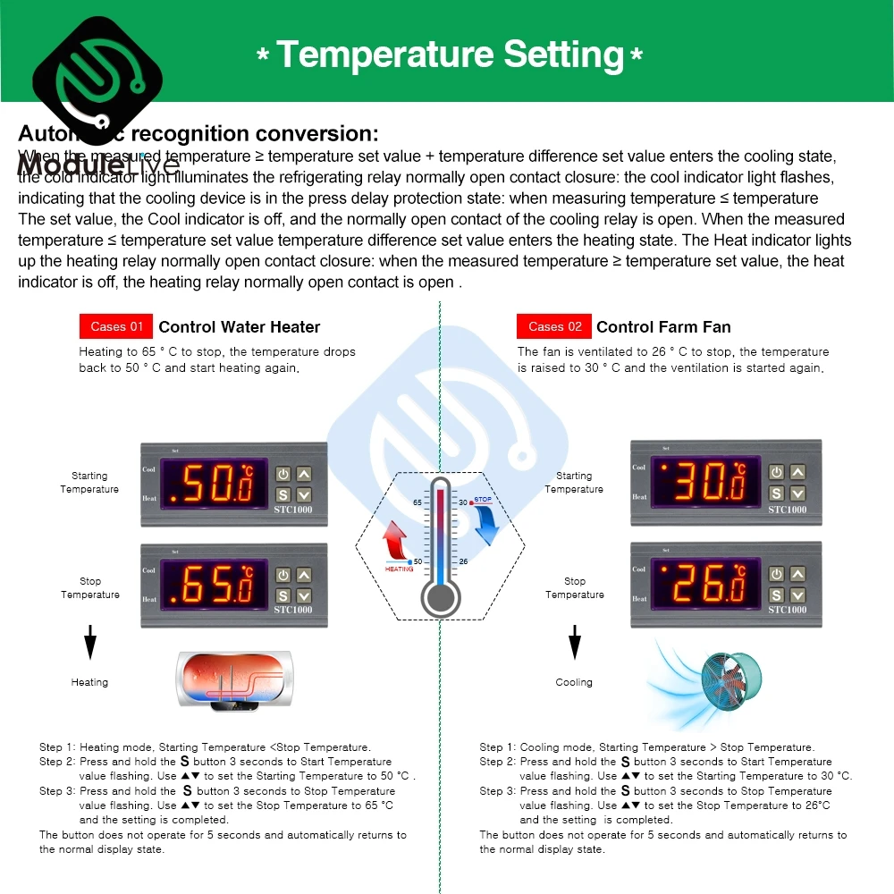 Диапазон контроля температуры: -50 ~ 110 градусов CРазрешение:-9,9 до 99,9-0.1deg C , 1 deg C температурных режимов (от другихТочность измерения: 0,1 deg CТочность управления: 0,1 deg CГистерезиса точность: 0,1 deg CЧастота обновления: 0,5 SЗащита от высоких температур: 0 ~ 110 градусов CВходная мощность: DC12V / 24V / AC 110V-220VИзмерительные входы: NTC (10K 0.5%) водонепроницаемый датчикВыход: 10 a релеЭкологические требования: -10 ~ 60 градусов Цельсия 20% -85%Потребляемая мощность: Статический ток:<= 35ма, притягивающий ток:<= 65маЛегкий и удобный в использованииРазмер: прибл. 48 (Д) x 40 (Ш) x 14 (Д) ммОбщий вес: 20 гВес посылка: 30 г