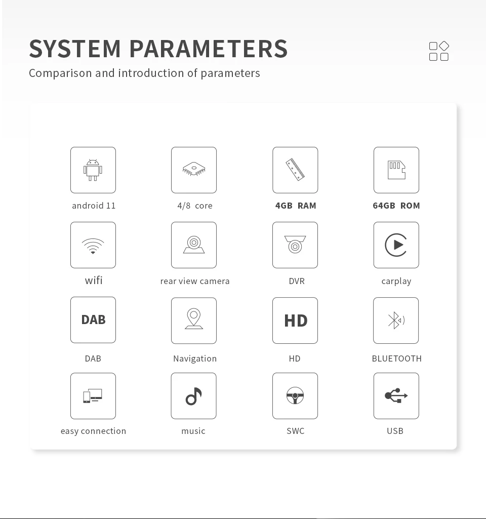 0. Встроенный Carplay и Android Auto1.1024X600 HD ips емкостный сенсорный экран, DSP2. Процессор: Android 11 64 бит четырехъядерный ARM A7 4*1,6 ГГц3. Оперативная память (память): 2 ГБ DDR34.Inand Flash: 32 ГБ