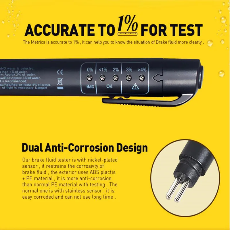 Ручка для обнаружения тормозной жидкости основана на изменении проводимости для определения изменения влажности тормозной жидкости. Он четко показывает степень влаги, содержащейся светильник светоизлучающих диодах, высокое содержание влаги приведет к снижению температуры кипения, что влияет на эффективность торможения. Красный указывает на необходимость немедленной замены тормозной жидкости, зеленый цвет-хорошее состояние, желтый-состояние приемлемо, но вскоре замена.