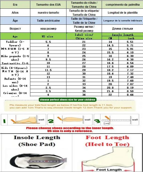 Пожалуйста, проверьте длину стельки обуви вашего ребенка перед размещением заказа. Мы отправляем обувь по длине стельки