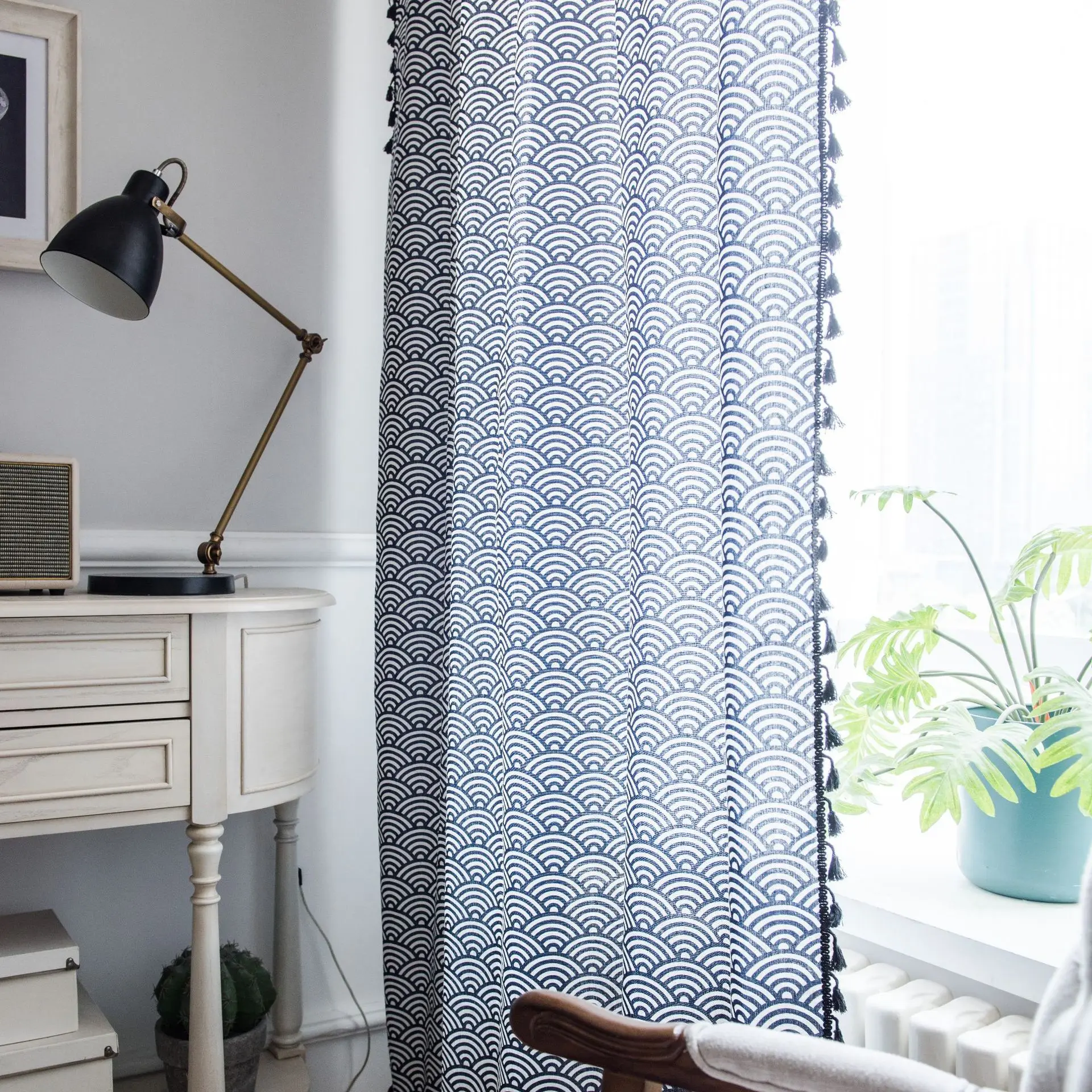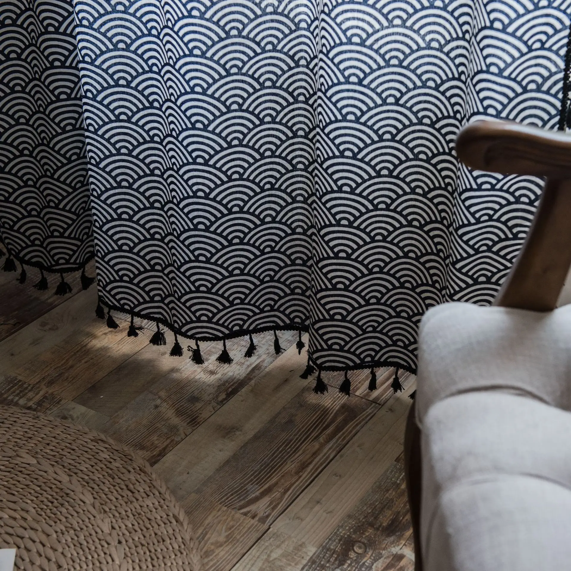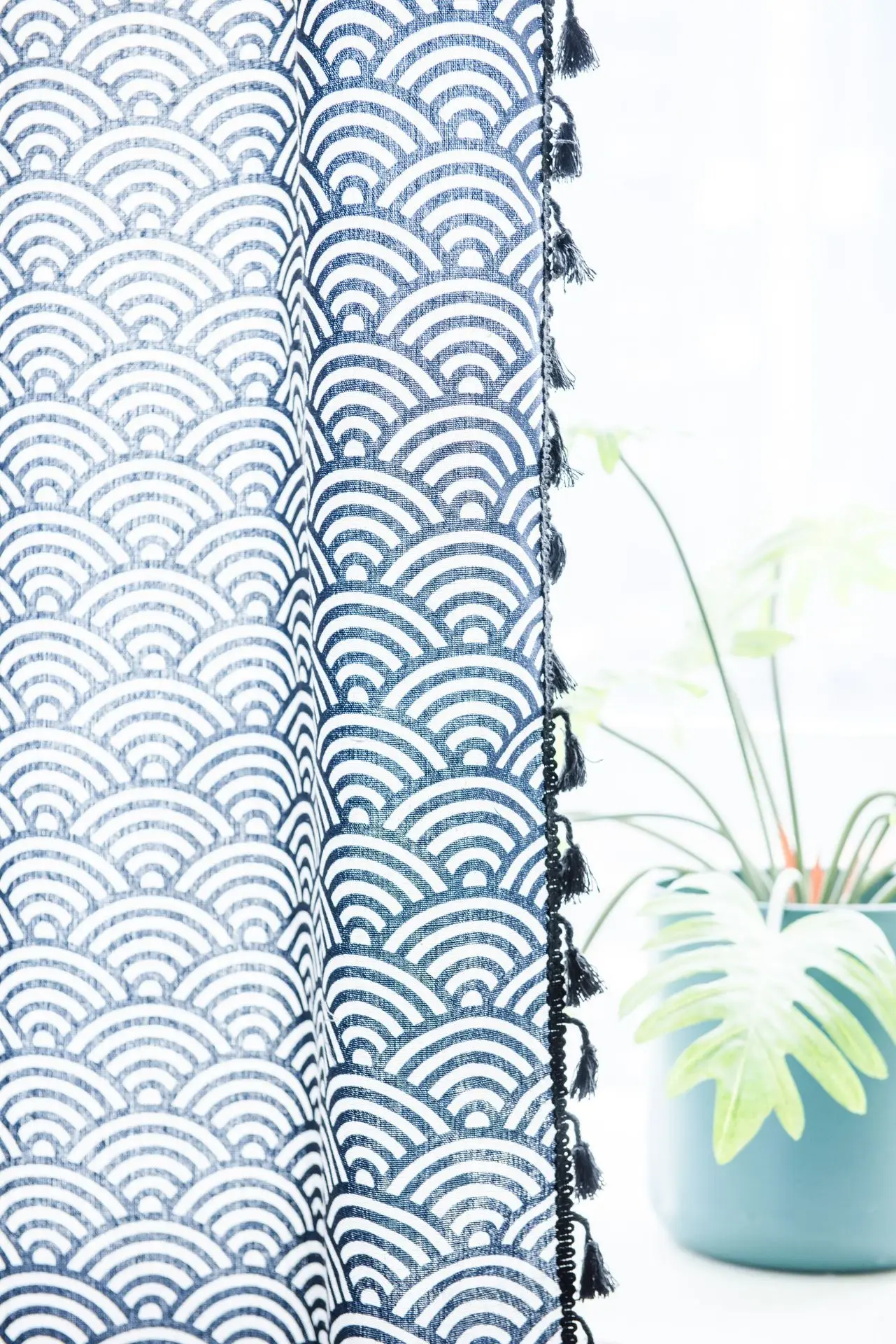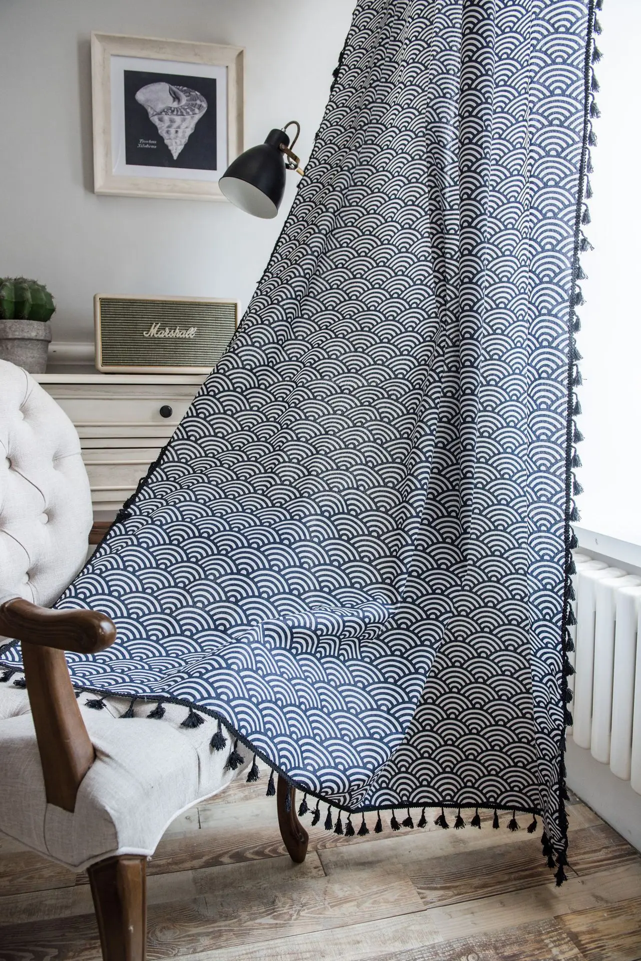 Льняные шторы в японском стиле zakka, черные кружевные занавески для гостиной, спальни, кухни, окна, синий занавес-волна, Короткие готовые