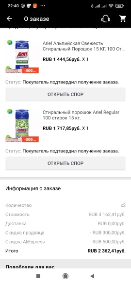 Не удержалась и использовала промокод - скидка 300 рублей - на 15-ти килограммовую упаковку Ariel Альпийская Свежесть, универсальный стиральный порошок 100 Стирок. Купила на TMALL, продавец из РФ, Супермаркет Гармония Цен. Доставили через 2 дня, домой, в Ростов-на-Дону, бесплатно. Упаковали дополнительно в картонную коробку, ее обмотали еще пластиковой пленкой. Но запах все равно очень сильный, придется пересыпать в герметичные контейнеры. Рекомендую товар и продавца, у которого часто проходят акции.