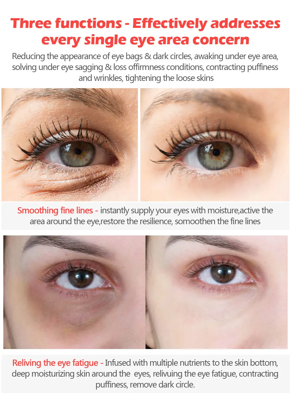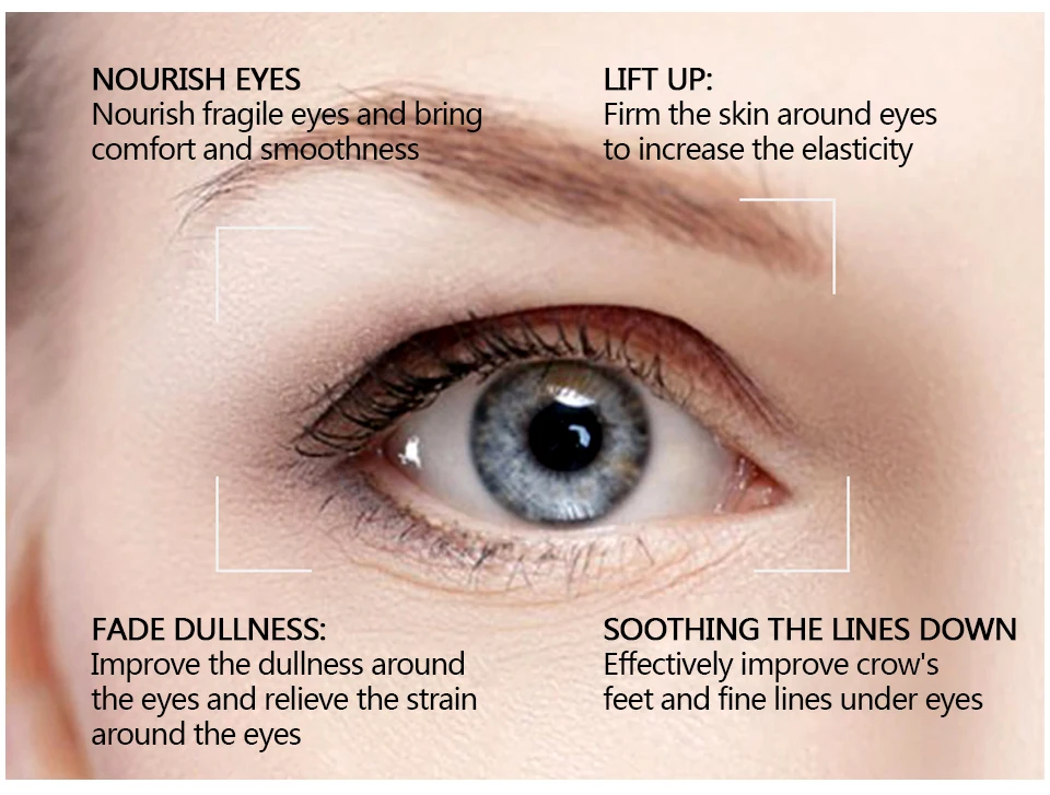 Три функции-эффективно борется с каждой областью вокруг глаз, уменьшая внешний вид мешков для глаз и темных кругов, пробудя под областью вокруг глаз, решая проблемы при обвисании глаз и потере неровности, затягивая отечность и морщины, подтягивающие свободные кожи, разглаживающие мелкие линии-мгновенно снабжают глаза влагой, активируют область вокруг глаз, восстанавливают упругость, Somoothen тонкие линии восстанавливают усталость глаз-наполнены множеством питательных веществ к нижней части кожи, глубокое увлажнение кожи вокруг глаз, снятие усталости глаз, увеличение отечности, удаление темного круга.