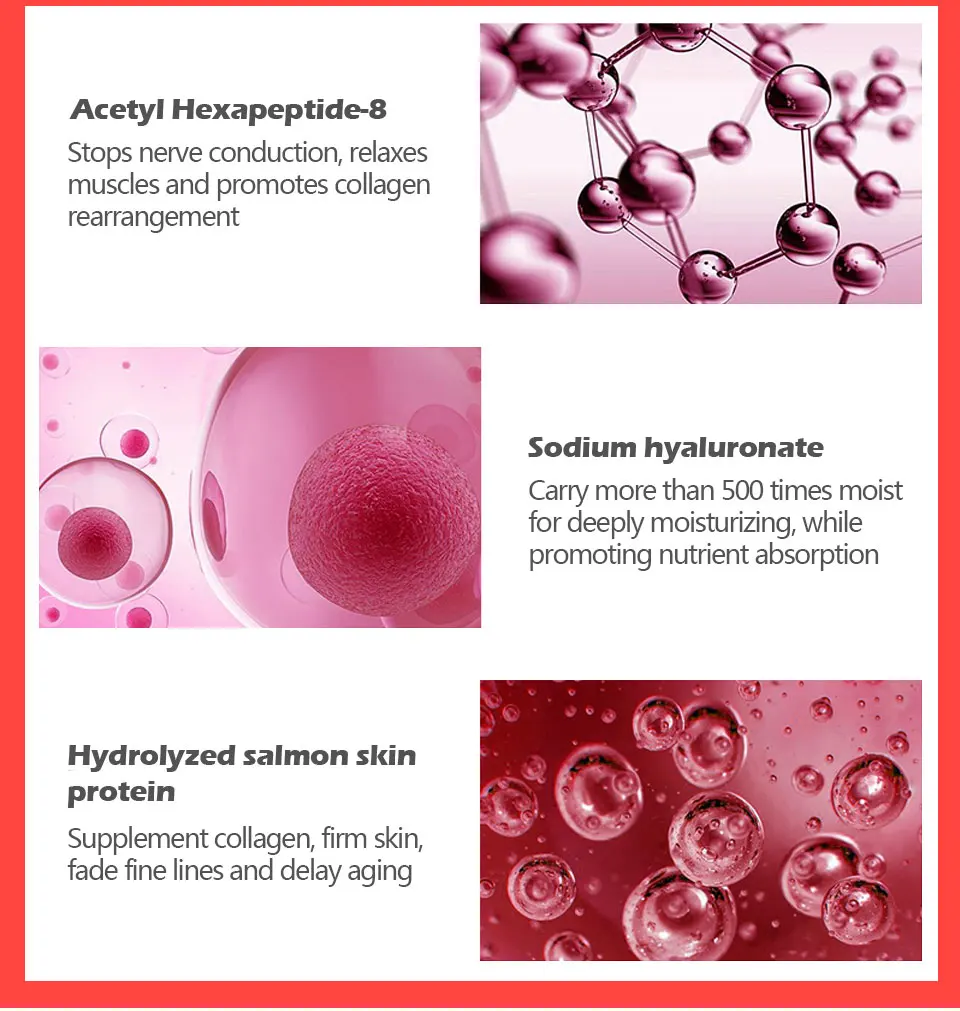 4 активных ингредиента и ровные линии выцветания утюжить знаки возраста для оздоравливания и осветления глаз что такое пептидный крем для глаз? Может быть быстро преобразован в питательные ингредиенты, необходимые ells, позволяют клеткам кожи восстанавливать жизненную силу, как возрождение, он эффективно избавляет и подавляет морщины и ноги вороны вокруг глаз, И окружающие сокращения и действия, помогает расслабить кожу и сделать кожу упругой организации восстанавливают мягкие и гладкие линии ацетил Hexapeptide-8 останавливает проводимость нерва, Расслабляет мышцы и способствует перестановке коллагена гиалуронат натрия переносит более чем в 500 раз увлажнение для глубокого увлажнения, стимулируя поглощение питательных веществ гидролизованный лосось, добавка к белку кожи коллаген, твердая кожа, выцветание тонких линий и задержка старения