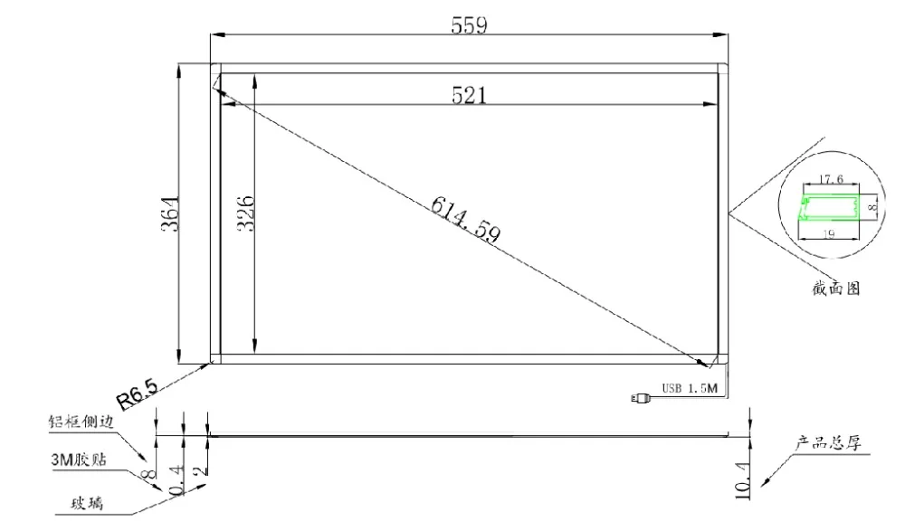 24 дюйма 10 точек 16:10 соотношение ИК мульти сенсорный экран Размер продукта чертеж: