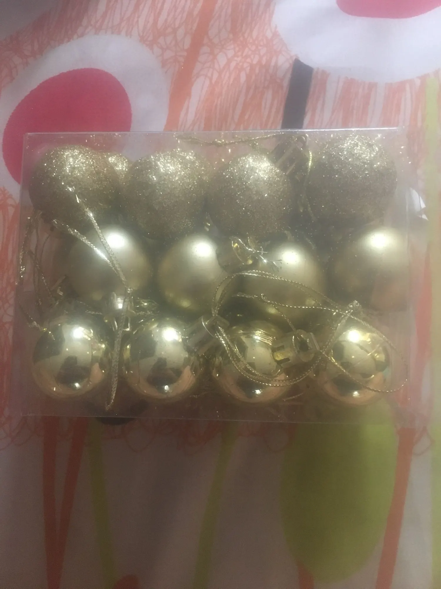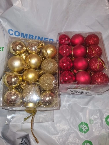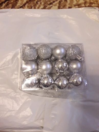Шарики пришли в ужасном состояние,коробка вся помята была,шарики практически все тоже помяты и верхней части,за которые вешать ниточку отсутствует. Плюс матовые шарики все поцарапанные. За такую цену можно и а магазине купить шары в разы лучше