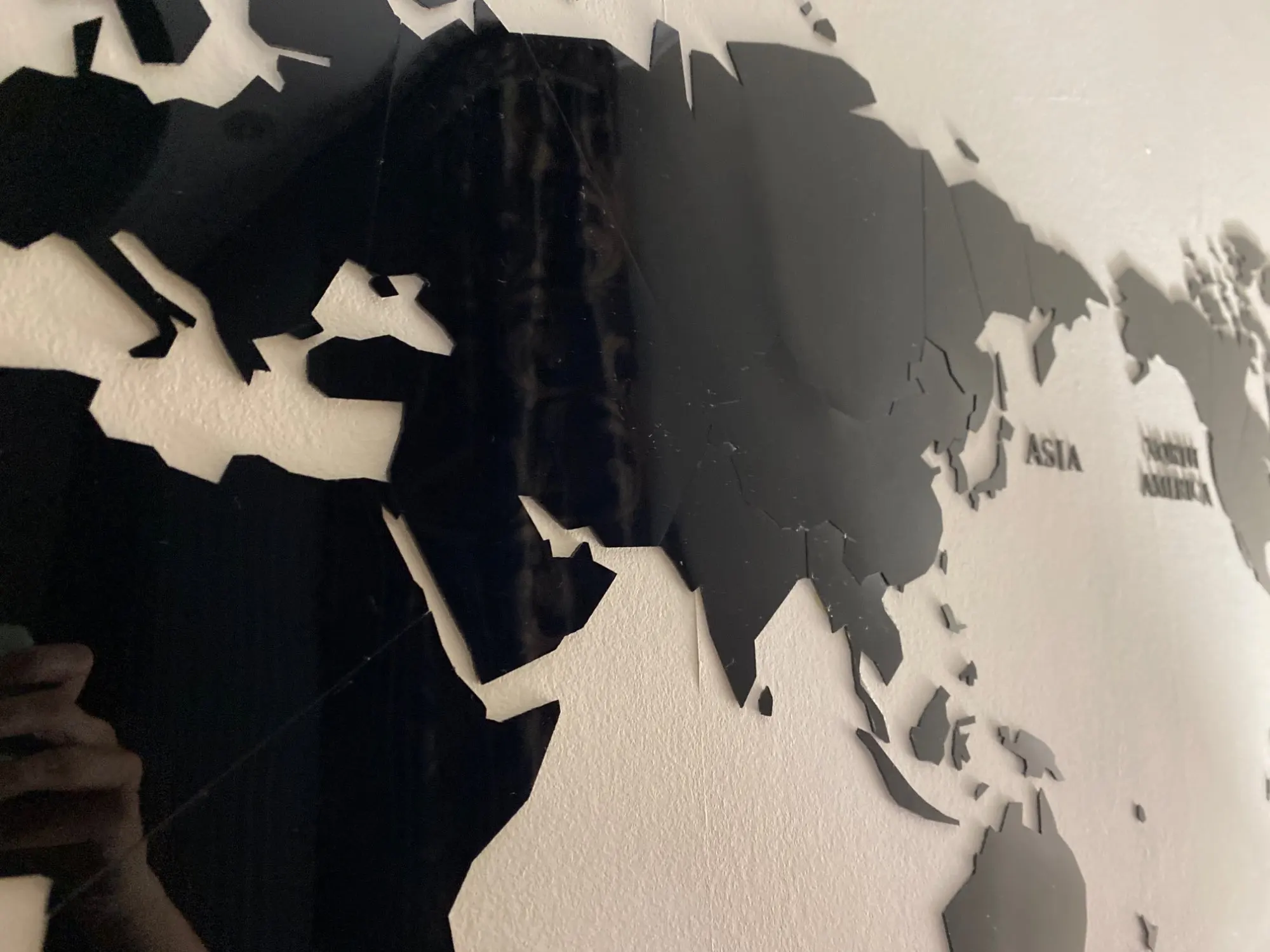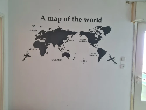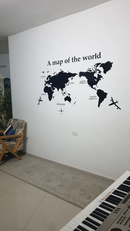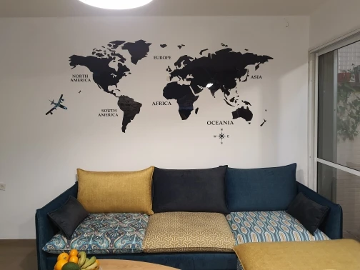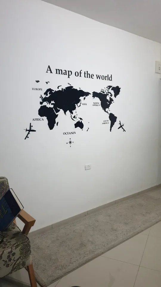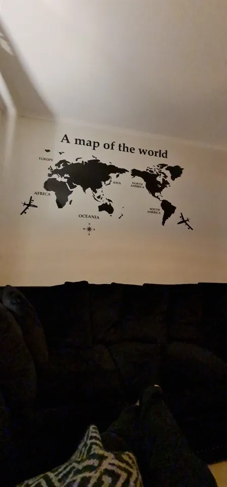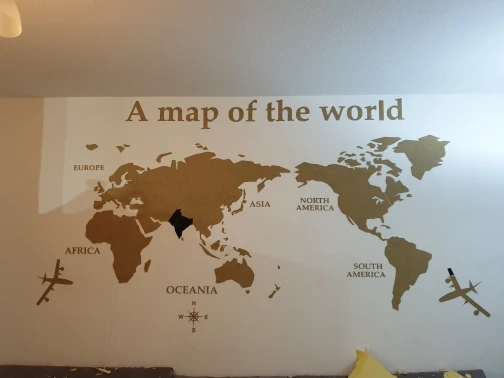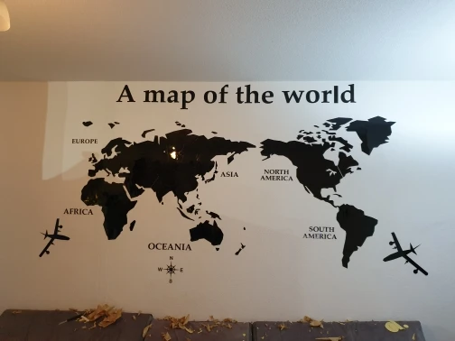 Great product! Map is great, the material is hard but thin. The template is perfect, if you put it up on the wall correctly sticking map is super easy. We were thinking between L and XL size, took L and we,re very happy with this size. Have a couch that is around 2.20 meters long, the wall is around 4x3 meters and L looks perfect, not too big. On our we glued some green plants, so it looks even better! Took 2 weeks to deliver.