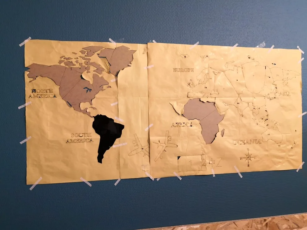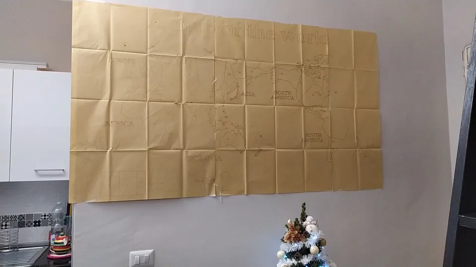 Ho fatto delle modifiche per mettere l'Europa al centro del quadro, perché ovviamente la guida dei pezzi è posizionata con la visione asiatica. Risultato ottimo dopo 6h di lavoro. Colla degli adesivi veramente forte.