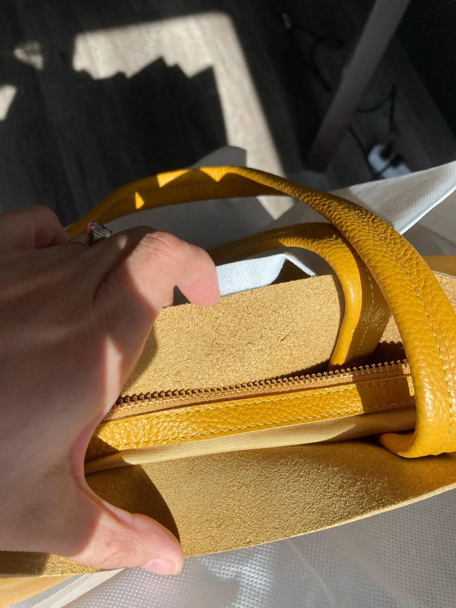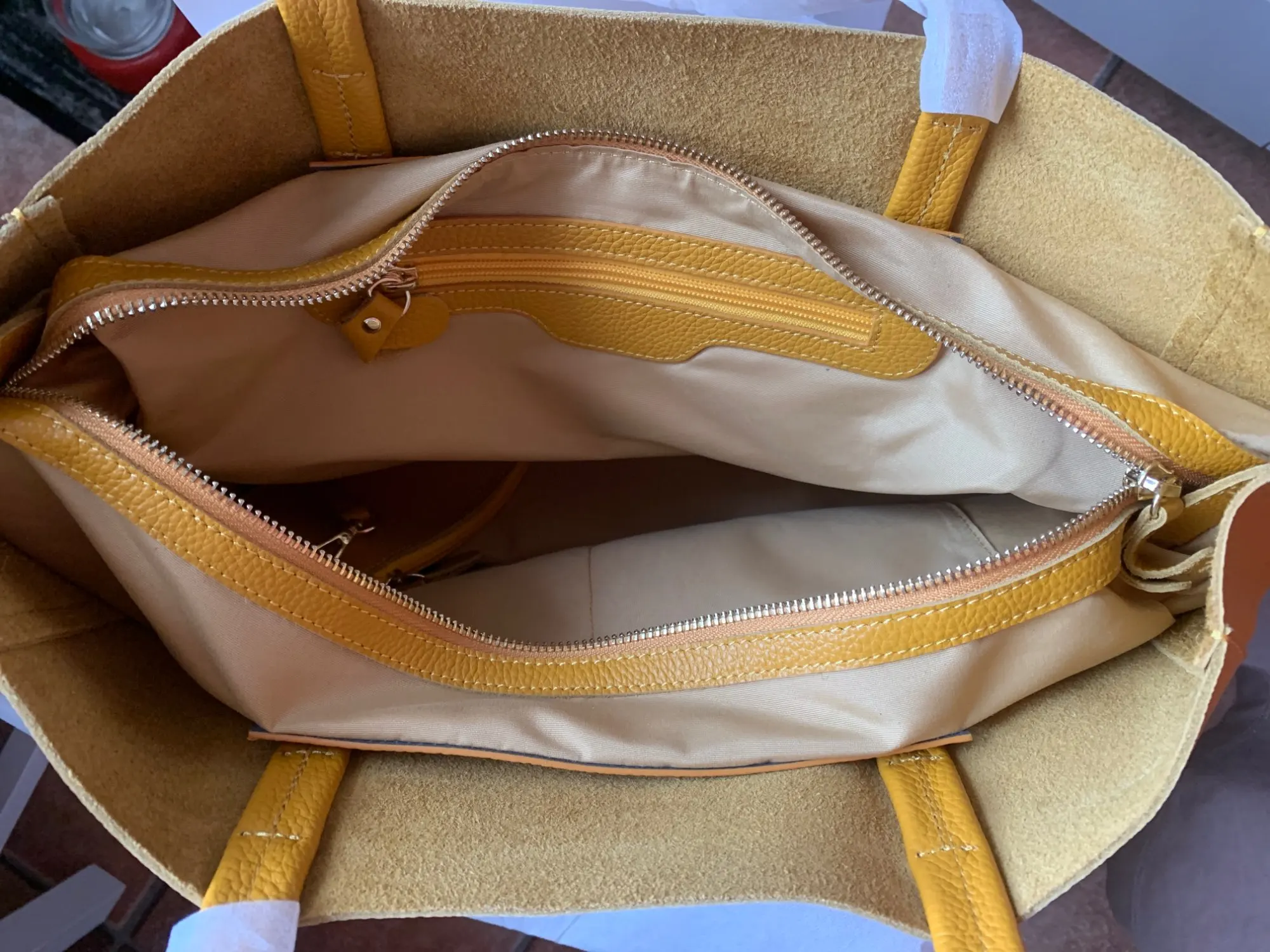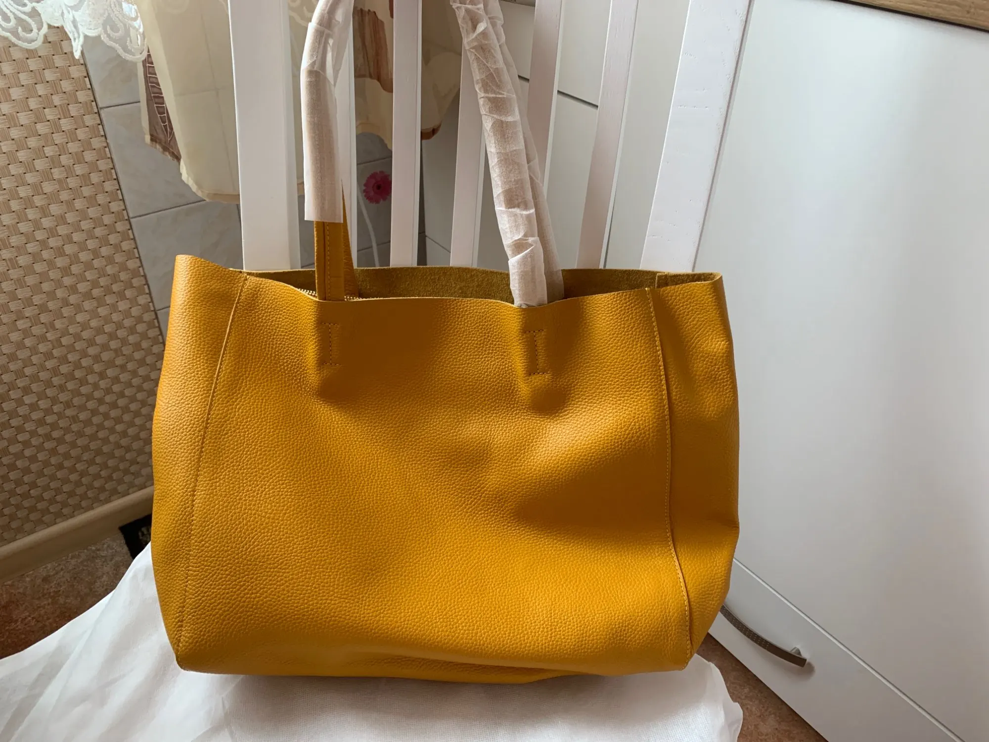 Очень красивая, тщательно отделанная кожаная сумка. Цвет более горчичный, чем lemon, но мне нравится.