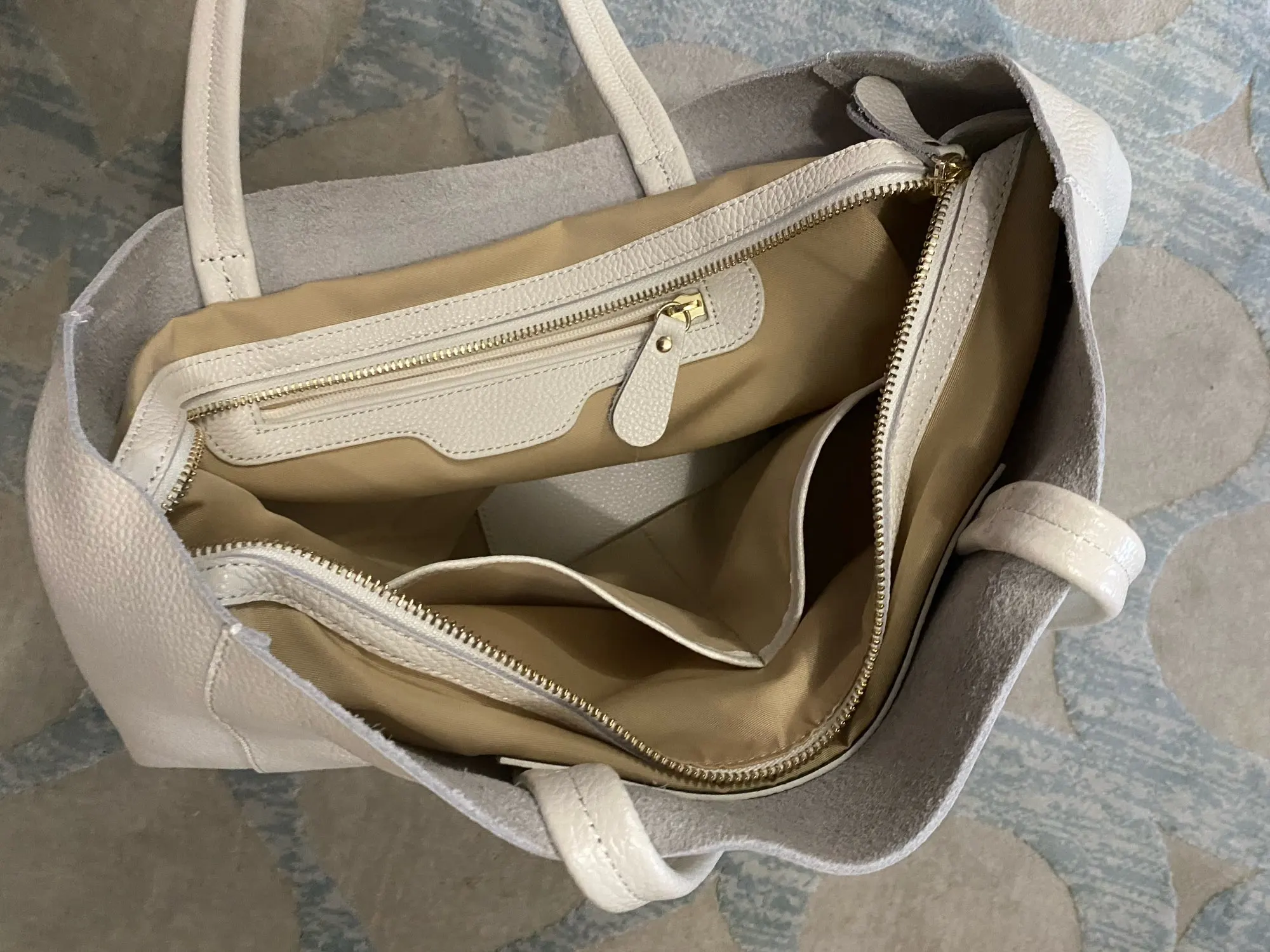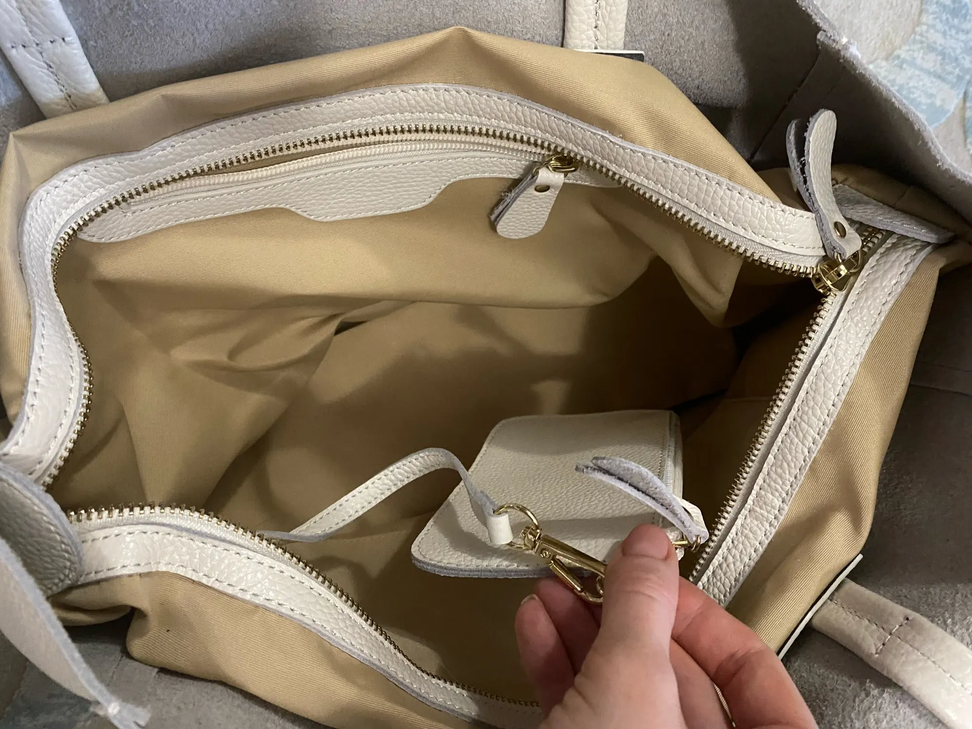 Сумка, конечно, не кипенно белая, скорее сероватая. Мягкая. Внутренняя текстильная часть пристёгивается на кнопки к кожаной части. Натуральная кожа. Нет неприятного запаха. Надеюсь, прослужит долго!