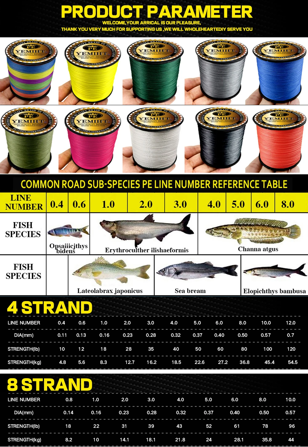 YEMIHT плетеная рыболовная леска 1000 м 500 м 300 м 100 м 8 прядей 4 прядей Карп Рыболовная плетеная леска equipamento de pescaИнформация о продуктеБренд: YEMIHTМодель: плетеная леска X4 X8Метров: 100 м 300 м 500 м 1000 м (опционально)Форма: уровеньМатериал: плетеный проводПлавучесть: плавающая линияПряди: 4 пряди/8 прядей (по желанию)Подходит: соленая вода/пресная вода Посылка в комплектеРыболовная леска-1 шт.
