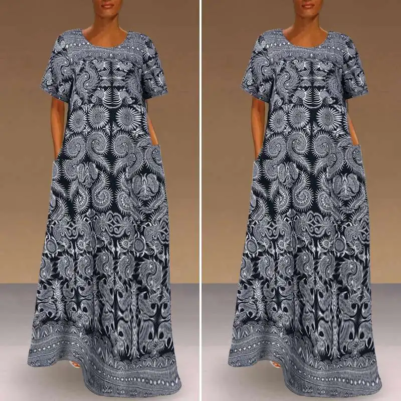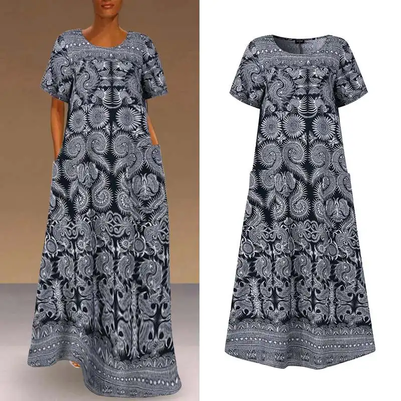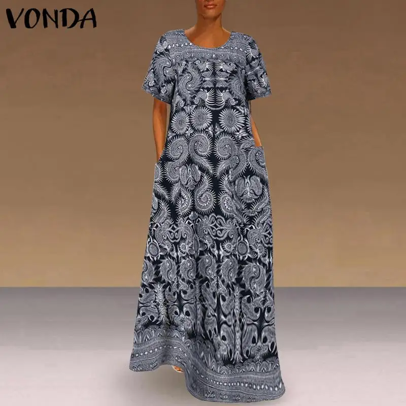 Платье VONDA женское с круглым вырезом, повседневное длинное винтажное платье макси в богемном стиле с коротким рукавом и принтом, 2021