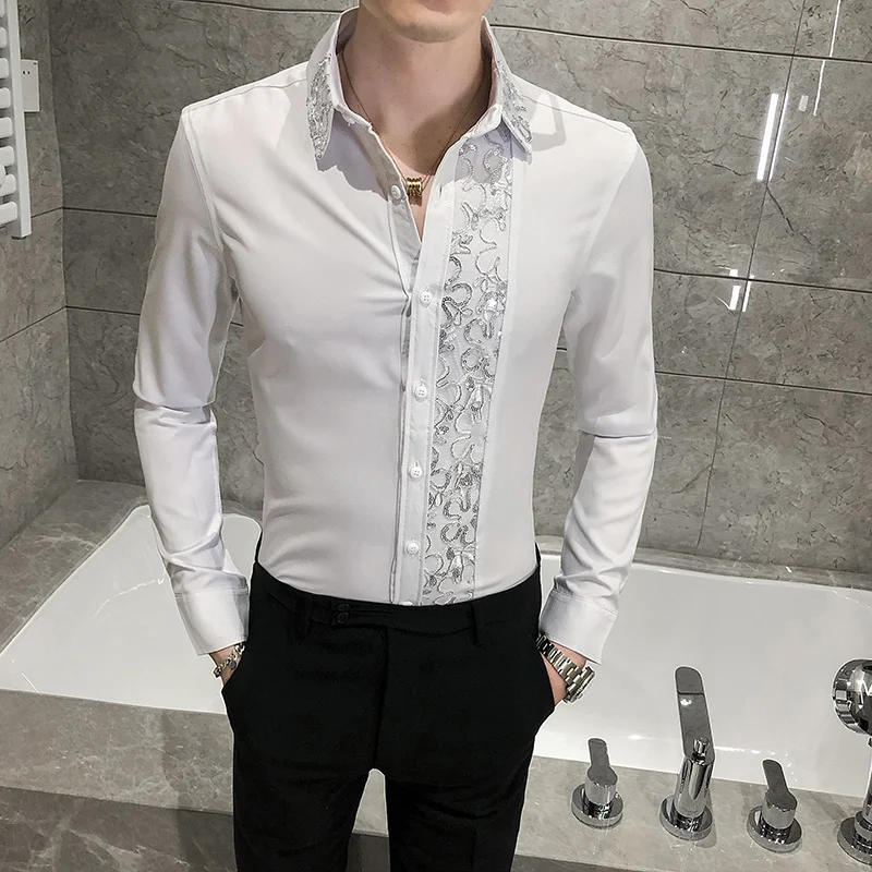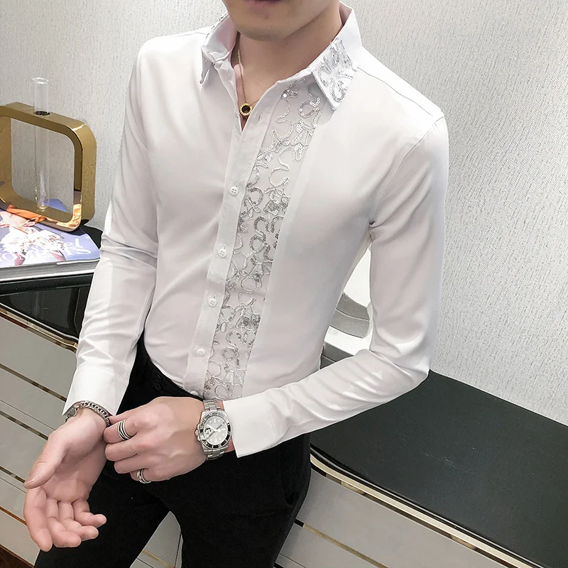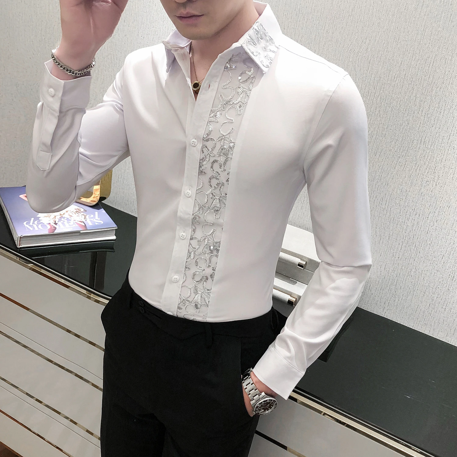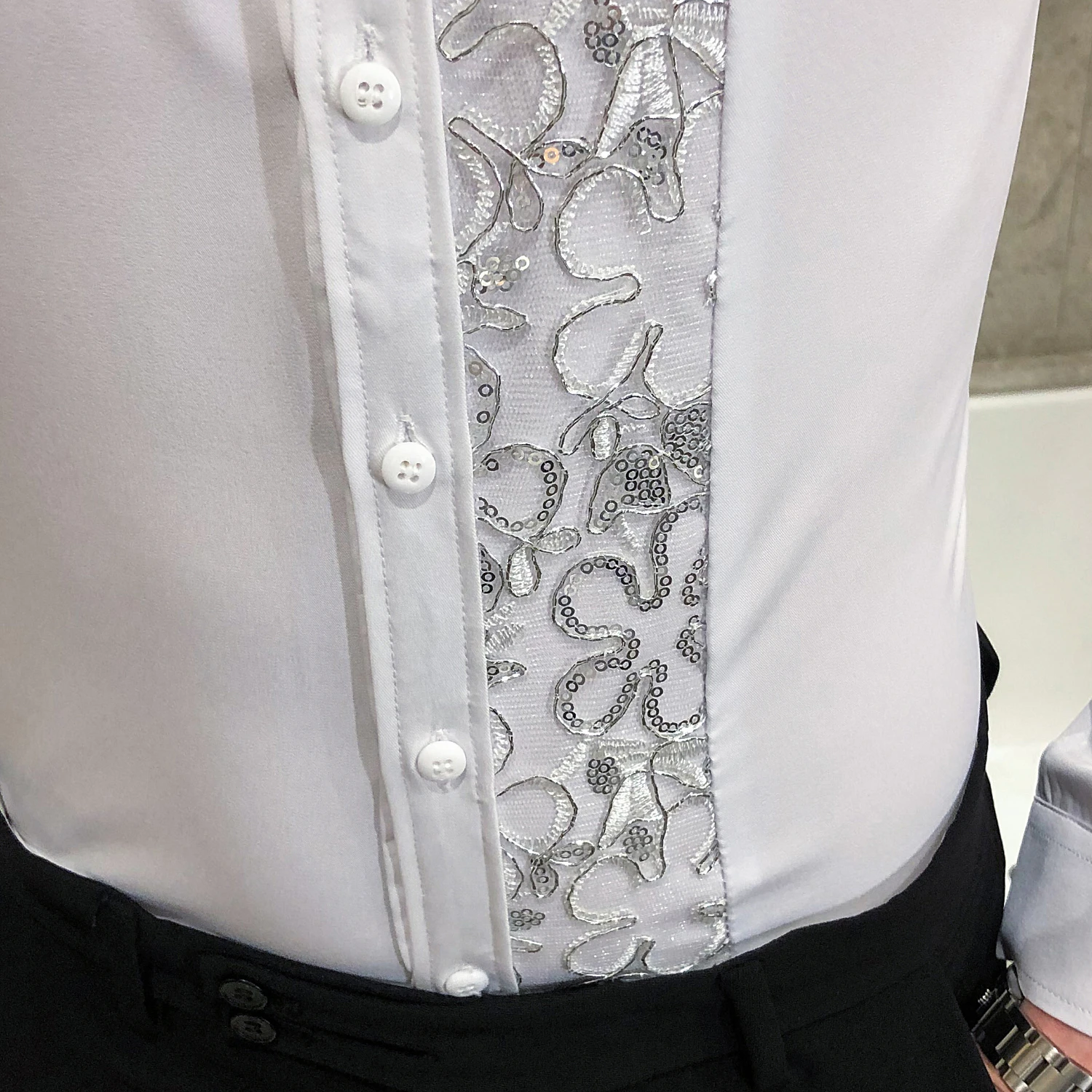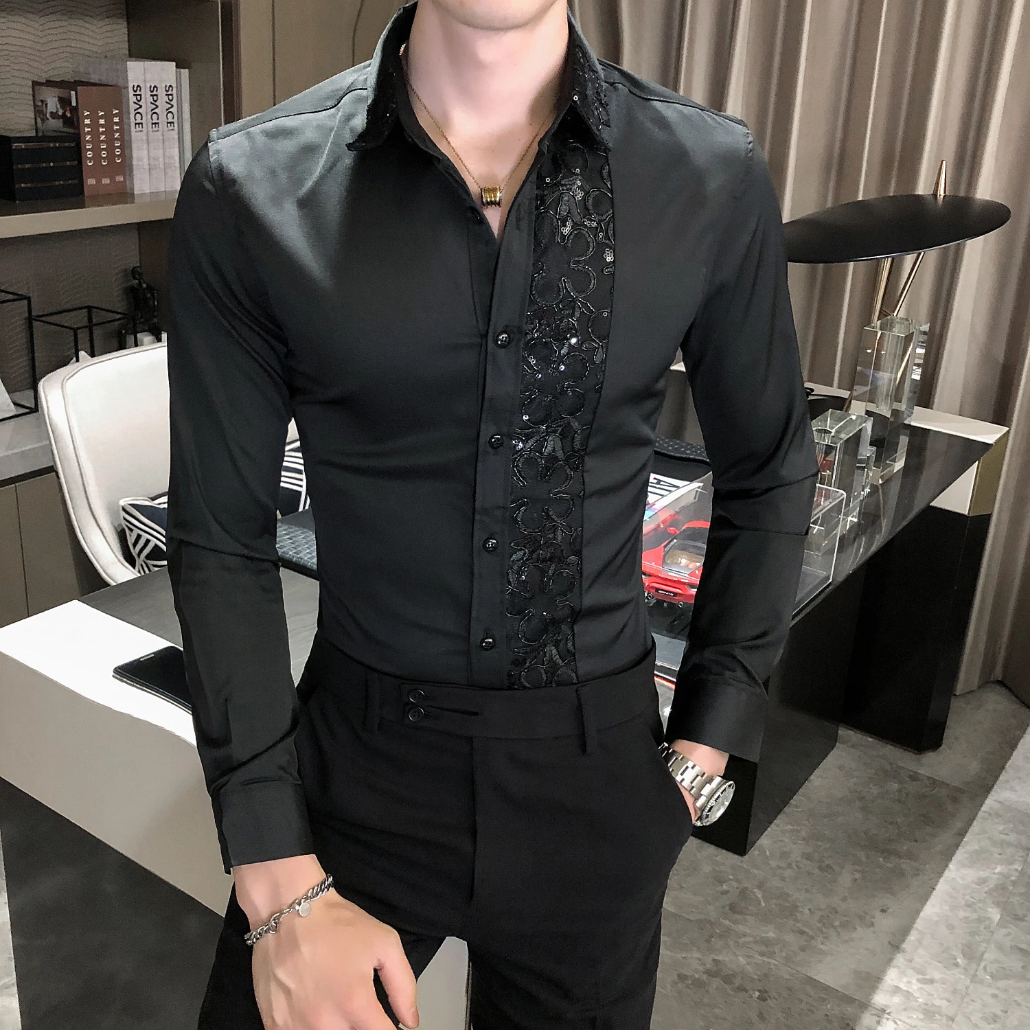 Мужская кружевная рубашка, Чернаябелая приталенная рубашка с длинным рукавом, в Корейском стиле, осень 2020