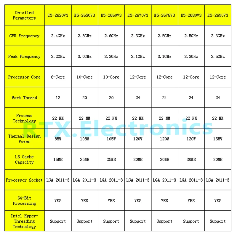 Номер моделиE5-2620V3 E5-2650V3 E5-26603 E5-2670V3 E5-2678V3 E5-2680V3 E5-2690V3