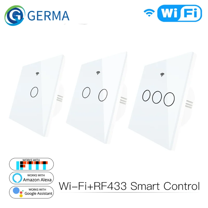 Стеклянная панель RF433 сенсорный Умный Переключатель 1/2/3 Gang Wi-Fi пульт дистанционного управления выключатель света работает с Alexa Google HomeGlass панель RF433 сенсорный Умный Переключатель 1/2/3 Gang Wi-Fi пульт дистанционного управления выключатель света работает с Alexa, поддержка Google Home От Герма