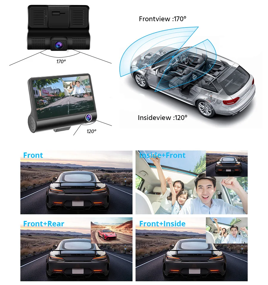 Видеорегистратор автомобильный, 3 камеры, экран 4,0 дюйма, двойная запись внутри и снаружи