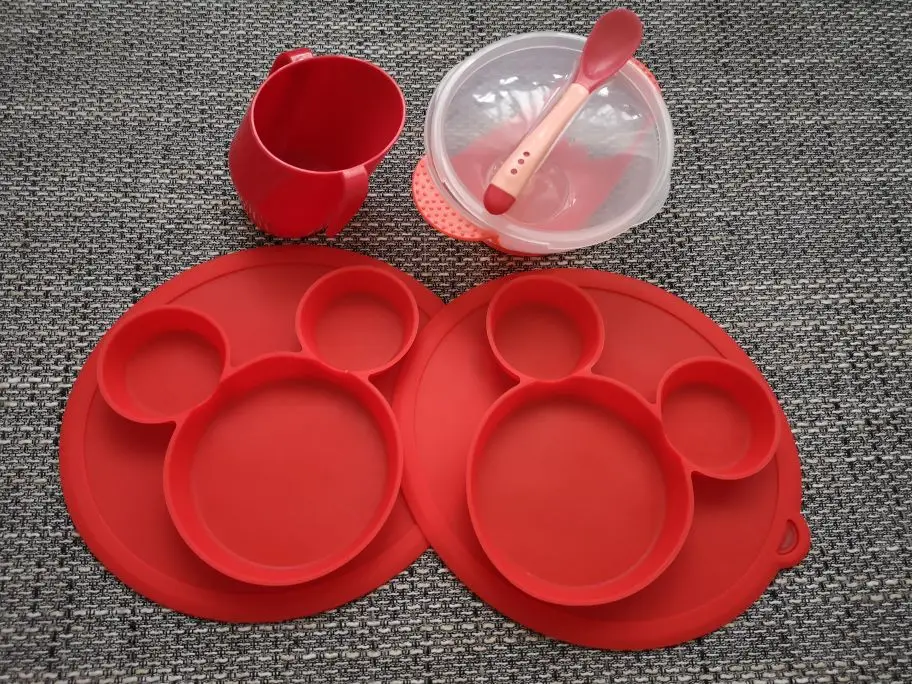 Ложка і вилка силіконові, але на дуже м'які. коли занурити ложку у гарячу воду вона міняє колір, можна знати що загаряче. До столу ми ще не навчились приклеювати тарілку намертво, але хоча менше рухається по столу.
