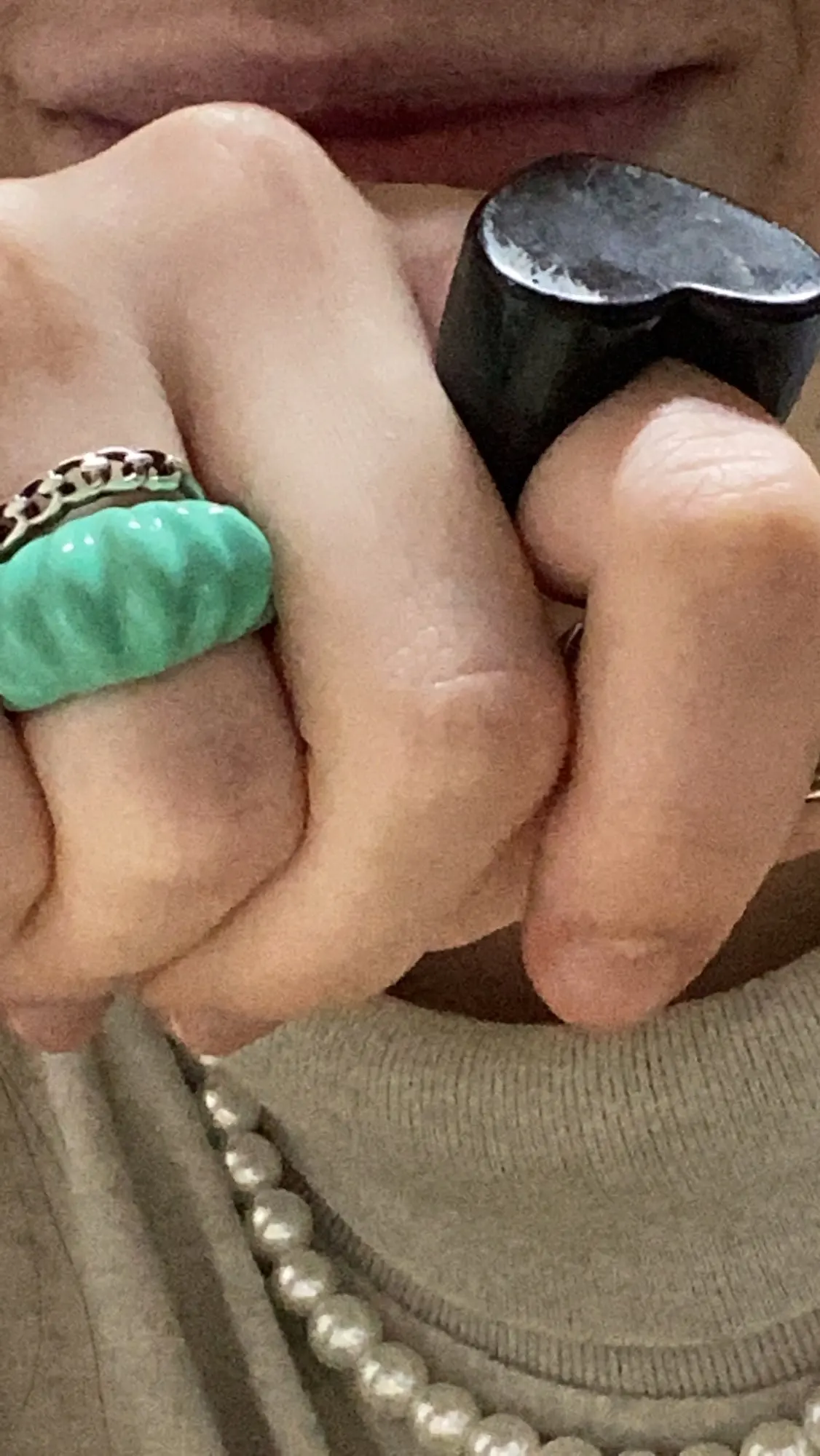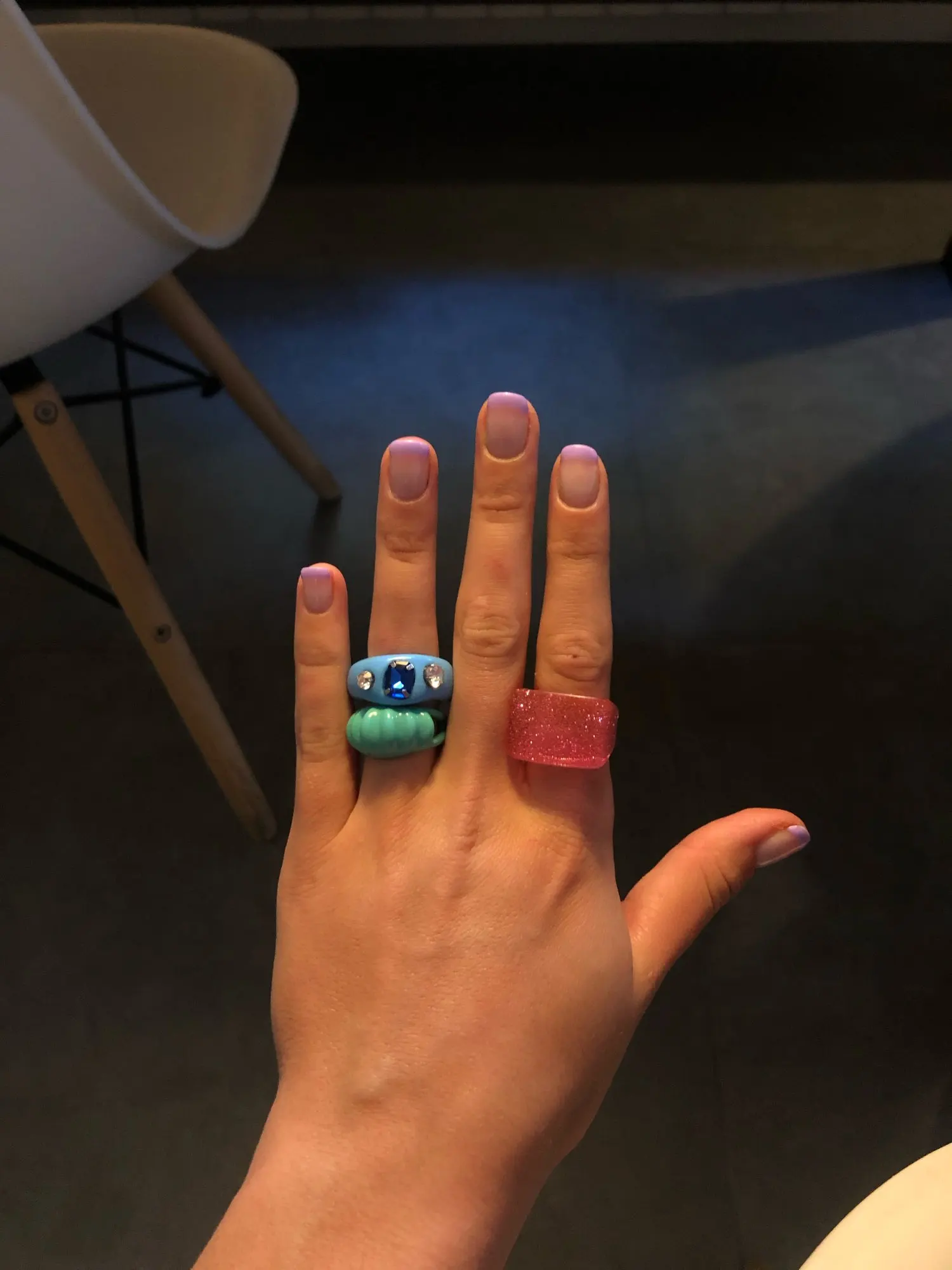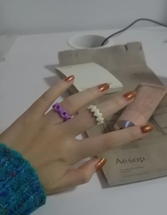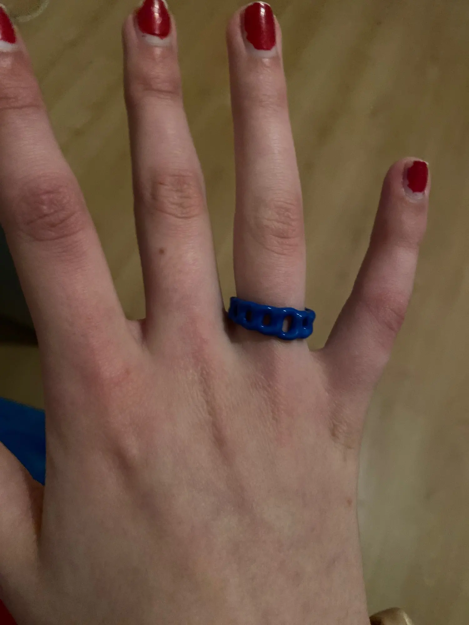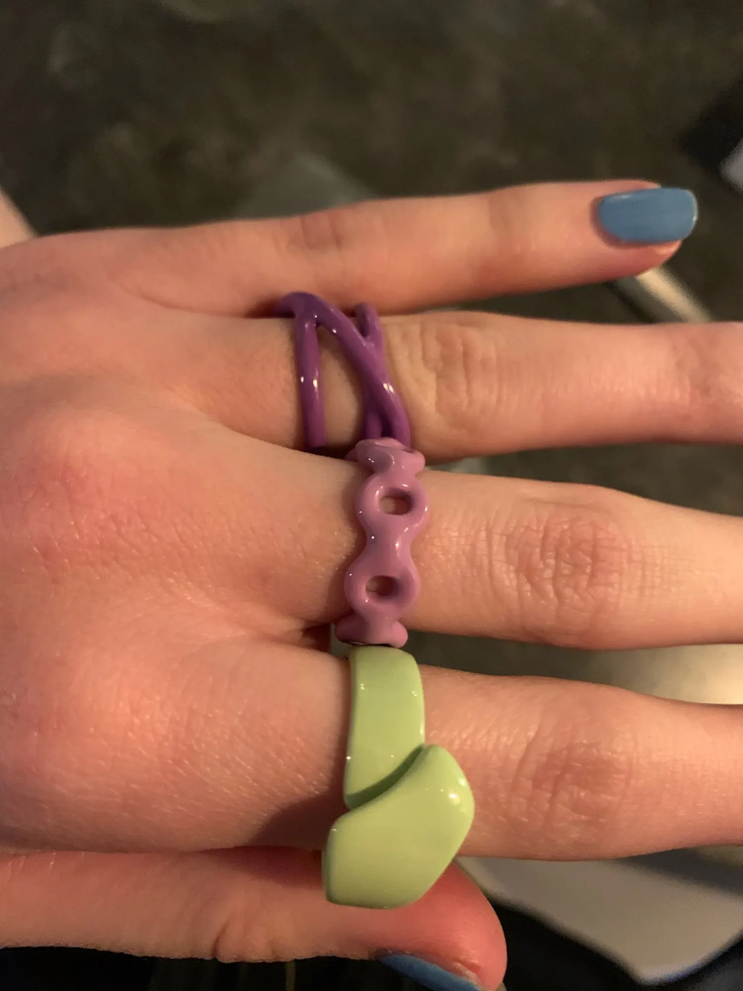 кольца очень красивые! сделаны качественно, на руке ощущаются удобно. думала, будут пластиковыми, но материал похож на какой-то металл, покрытый цветной эмалью, потому что кольца тяжеловаты для обычного пластика. в целом, я довольна!