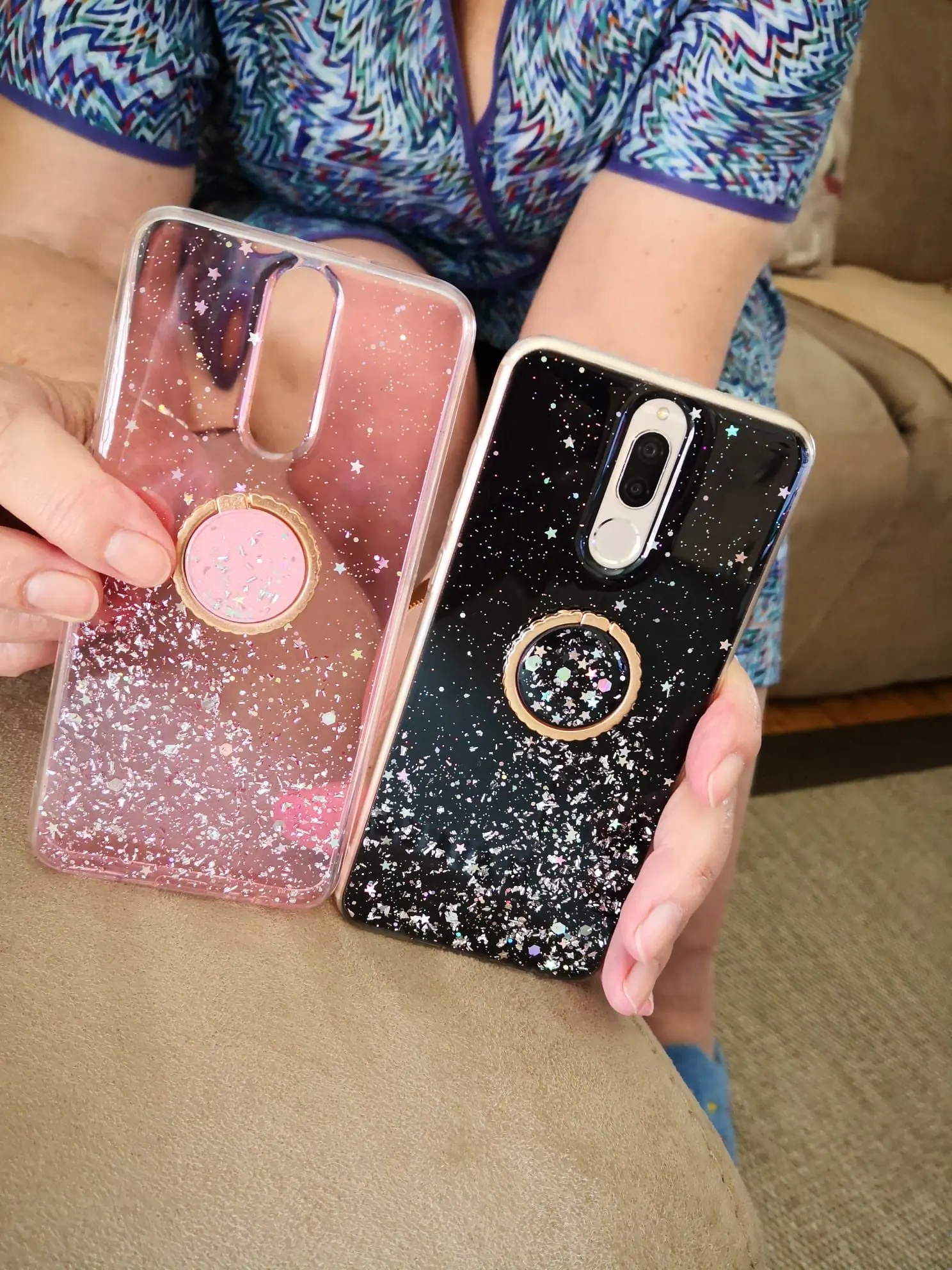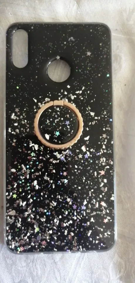Кольцо очень тугое и вырез под камеру длиннее чем нужно. На телефон хонор 10 лайт подошёл, все отверстия совпадают. Согшусь с другими отзывами- блесток меньше чем на картинке, но смотрится классно. Спасибо за быструю доставку.