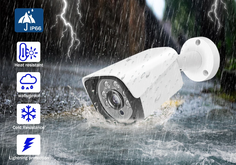 Используйте их в качестве наружных камер или внутренних камер, так как они построены жестко, чтобы выдерживать любую погоду: дождь, снег, пыль и жаркие дни. С защитой от атмосферных воздействий IP66 и кабелями, проходящими через подставку для дополнительной защиты, гарантируем, что вы сможете ответить на их производительность, день в день. Наша камера имеет сверхпрочный металлический корпус, профессиональный IP66, устойчивый к атмосферным воздействиям, обеспечивая стабильную производительность как внутри, так и снаружи.