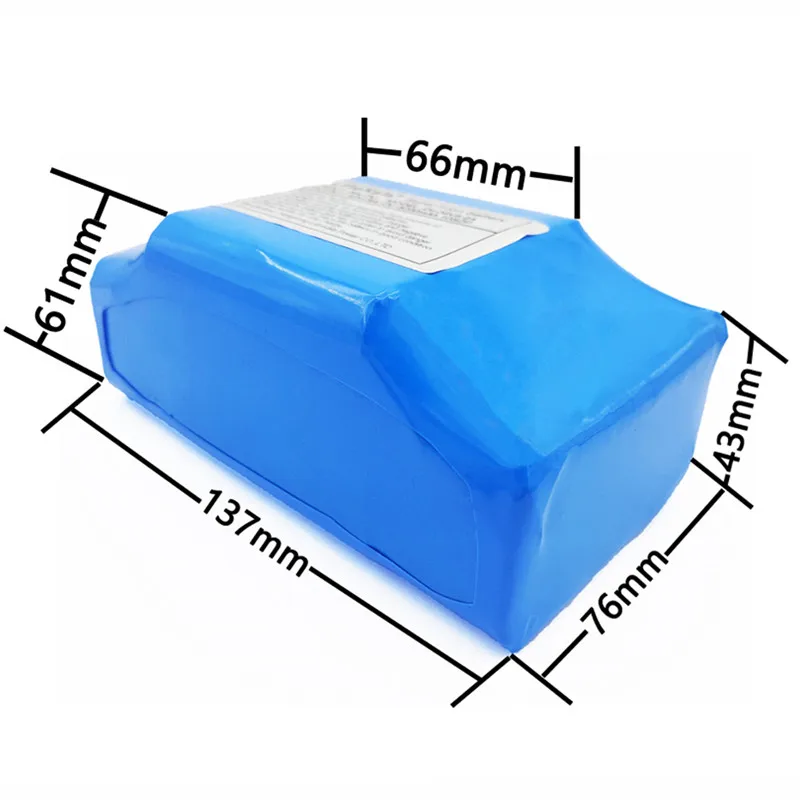 Применение: умный ХовербордНоминальное напряжение: 36 ВНоминальная емкость: 5200 мАчЯчейка: 18650 2600 мАчСборка: 10S2PКатегория: литий-ионный аккумуляторНапряжение: пиковое-42 в, рабочее-36 вЕмкость: 5,2 АчМощность: 158 ВтПредельное напряжение: 26 вМакс. Ток разряда: 30 АМаксимальный непрерывный ток разряда: 20 АНоминальный ток разряда: 15 АЗарядный ток: <5 АНапряжение зарядки: 43,2 вольтРазмер: 135*65*85 ммВес нетто: 970 гПробег ime: 15-20 км (зависит от веса и состояния дороги)Жизненный цикл: > 85% емкость после 1000 циклов.Жизненный цикл одной ячейки: >85% емкость после 1500 циклов, > 70% емкость после 3000 циклов. (Скорость разряда <1C и скорость заряда <1C)