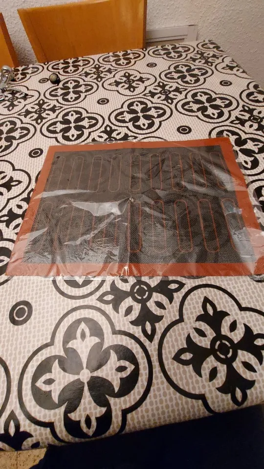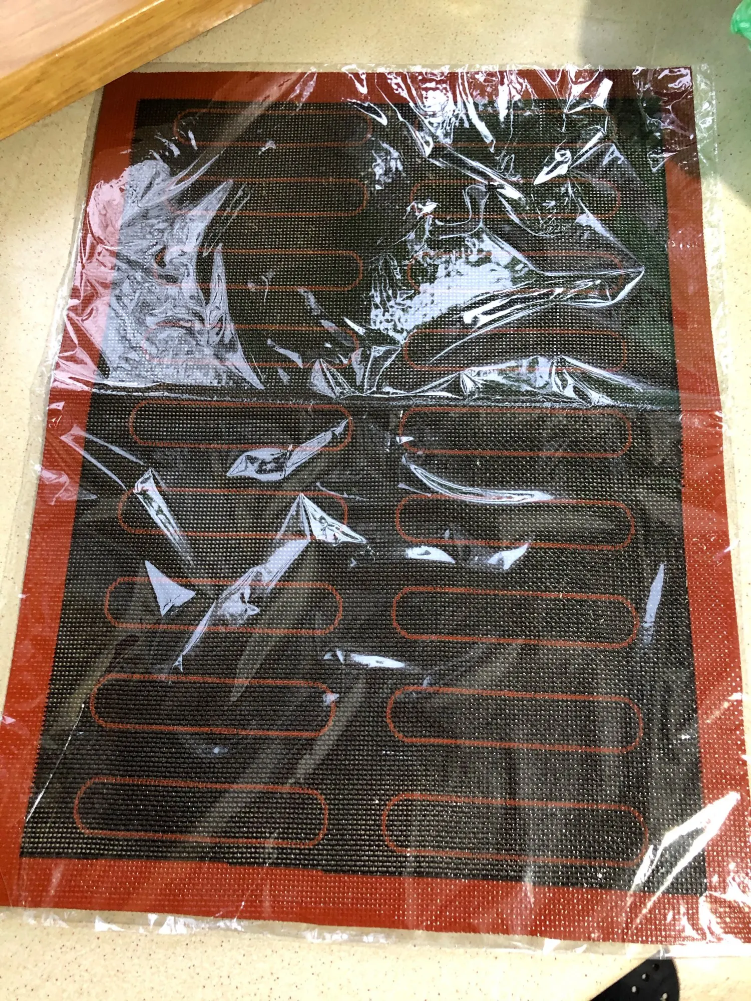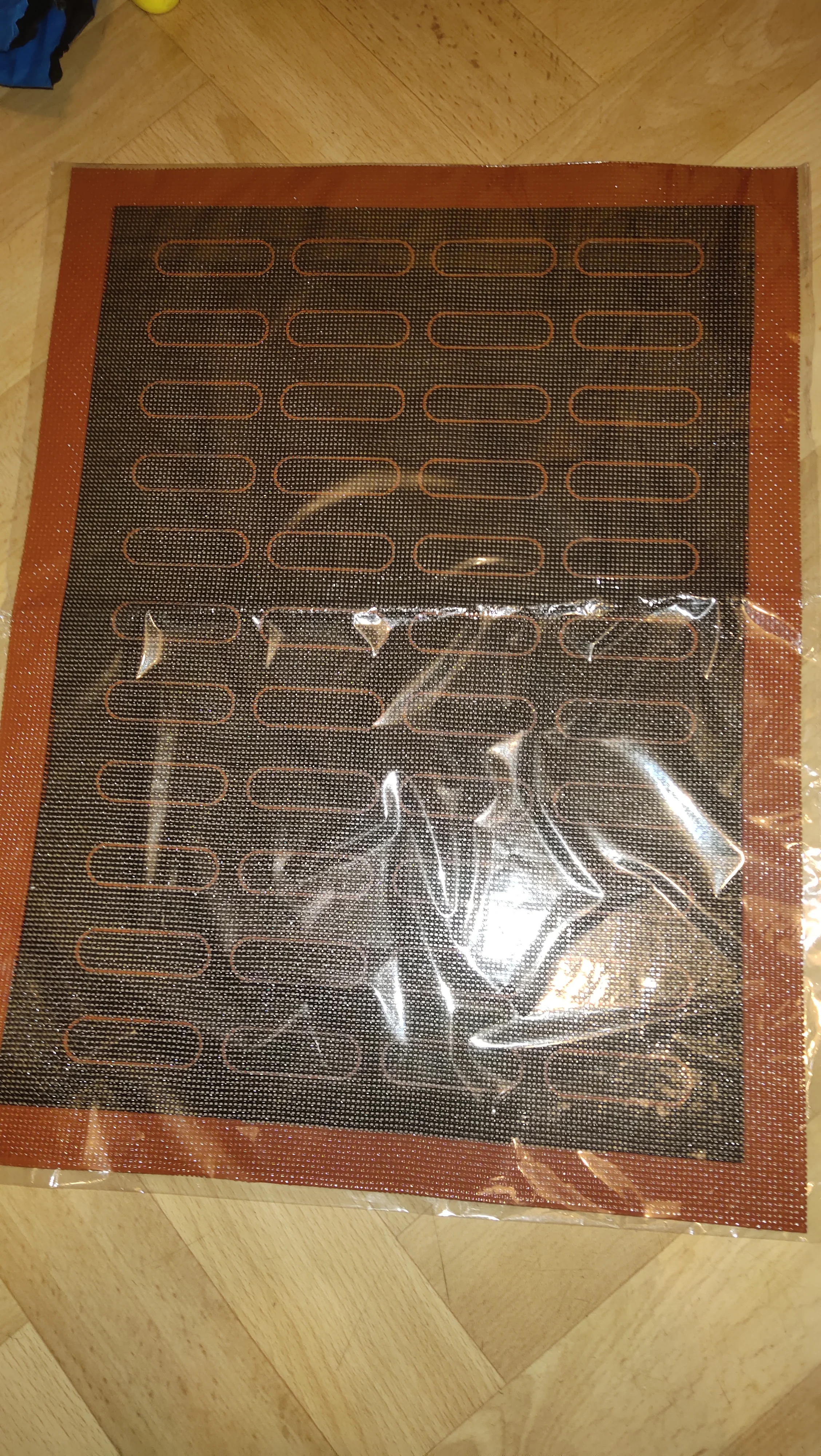 достаточно быстро пришла посылка.хорошо упакована. дефектов нет коврик вполне себе нормального размера, с двумя видами разметок для эклеров. сам по себе коврик не монолитный, с перфорацией.
