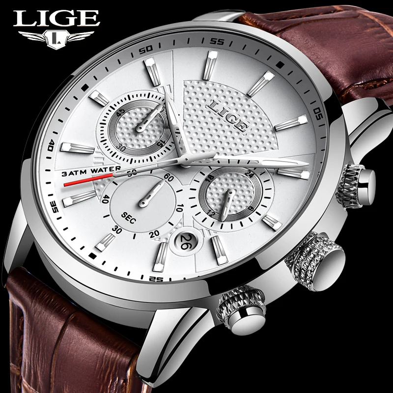 Часы наручные LIGE Мужские кварцевые с кожаным ремешком, брендовые ...