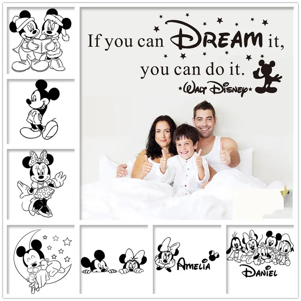 Название: Новые Настенные Стикеры с Микки и Минни для детской комнаты, декорированные буквами, виниловые наклейки для детской спальни Использование: детская комната, кабинет, спальня, гостиная Функция: наклейка на стену, плакат, наклейка, фотообои, пилинг и палочка Характеристики: самоклеющиеся, экологически чистые, съемные