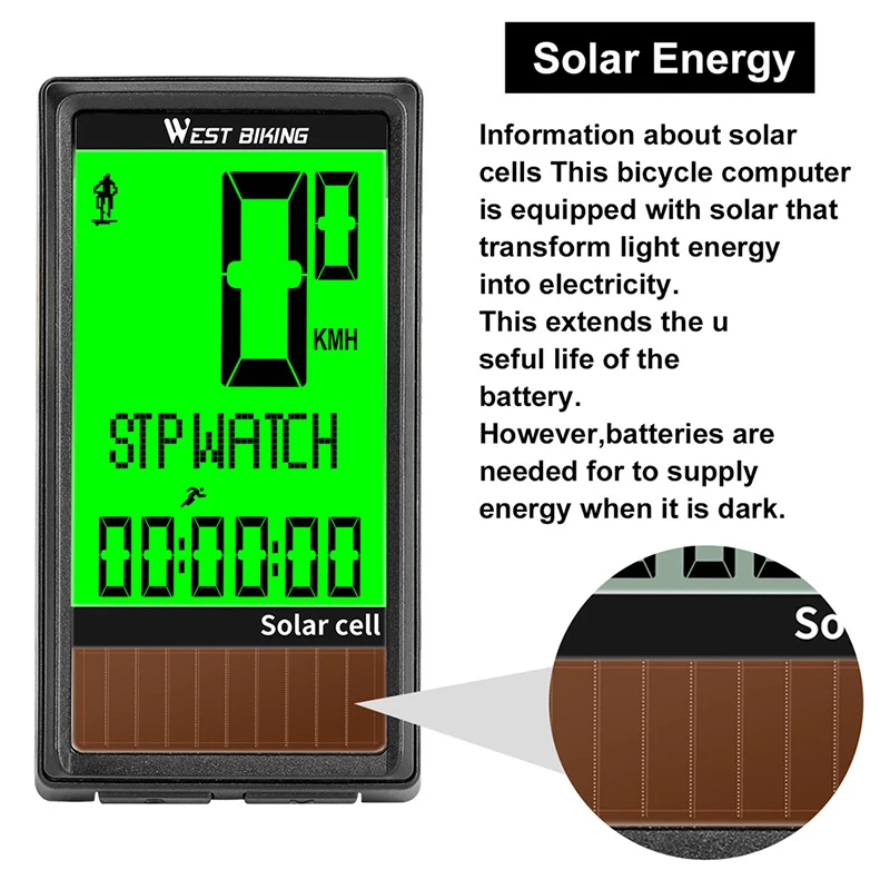 Солнечная энергия: солнечная панель Автоматически Заряжает на солнце, чтобы обеспечить дополнительную мощность для компьютера и продлить срок службы батареи.13 основных моментов: отображение текущей/средней/максимальной скорости, времени поездки, расстояния поездки, одометра, общего времени поездки, температуры, выбора велосипеда A/велосипеда B, калорий, смещения углерода, сканирования, 7 дней памяти данных.6 других функций s: выбор нескольких языков, часы, секундомер, Метрическая км/миля альтернатива, рекомендации сравнения скорости, автоматическая функция остановки.Простота в использовании: супер большой ЖК-экран с светодиодный подсветкой для удобного чтения данных. 2 смарт-кнопки для удобства эксплуатации.Удобно: небольшой размер, легкий и беспроводной дизайн делает его более удобным, отличный подарок для велосипедистов.Примечание: для велосипедного компьютера в основном работает на ячейка батареи, которая имеет долгий срок службы аккумулятора-Время работы до 1000 часов, время работы в режиме ожидания до 12 месяцев. Солнечная панель предназначена для обеспечения дополнительной мощности и продления срока службы батареи.Функции:Солнечная энергияОтображение пяти языков (английский, немецкий, французский, испанский, голландский)Выбор велосипеда A/Bike BЧасыСекундомерТемператураМетрический км/миля альтернативаСканирование (автоматическая циркуляция)Рекомендации для сравнения скоростиСкорость токаСредняя скоростьМаксимальная скоростьCO2 (смещение углерода)Потребление калорийВремя поездкиРасстояние поездкиОдометрОбщее время поездкиАвтоматическая память и обновление данных в течение 7 днейАвтоматическая функция остановкиСветодиодный светильник с подсветкой