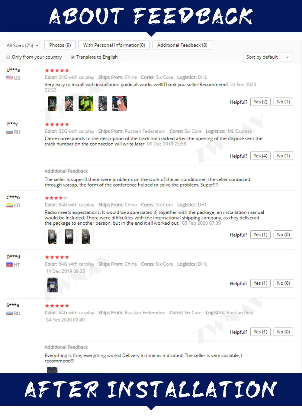 1. Таможенные пошлины и налоги являются обязанностью покупателей, мы, продавец не можем контролировать их и не будем нести за это ответственность, пожалуйста, обратите внимание на это, прежде чем разместить заказ. Если товар был возвращен из-за опровержения покупателя, чтобы очистить таможню или получить посылку, Доставка почтовых отправлений и дорогой сбор за возврат будут падать на ответственность покупателей. 2. Если ваш адрес доставки относится к удаленной области в системе доставки транспортной компании, вам необходимо добавить удаленную плату за доставку посылки или изменить более Сельский адрес доставки, В противном случае ваша посылка не может быть отправлена. Независимо от того, принадлежит ли ваш адрес удаленной области или нет, вы можете проверить свой адрес на DHL веб-сайте. 3. Пожалуйста, не поставляйте почтовый адрес, мы не можем отправить посылку на этот адрес. Примечание: российские клиенты должны указать свое полное имя для контактного имени на посылке