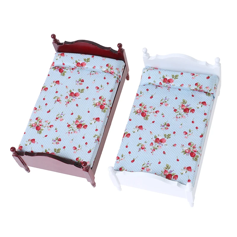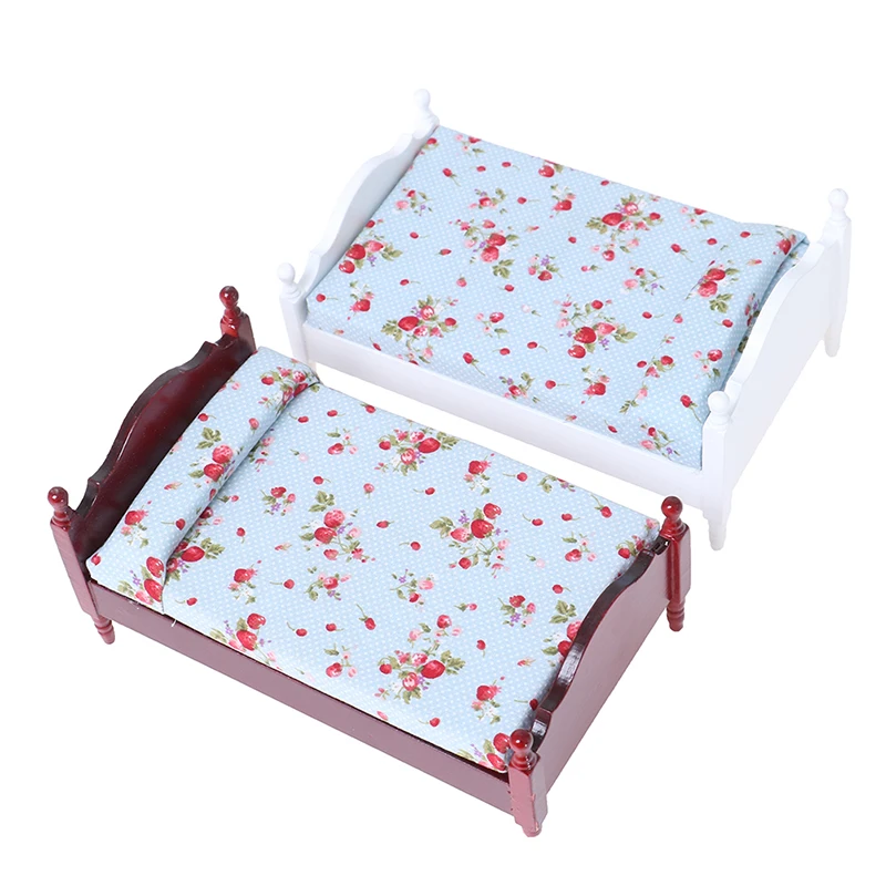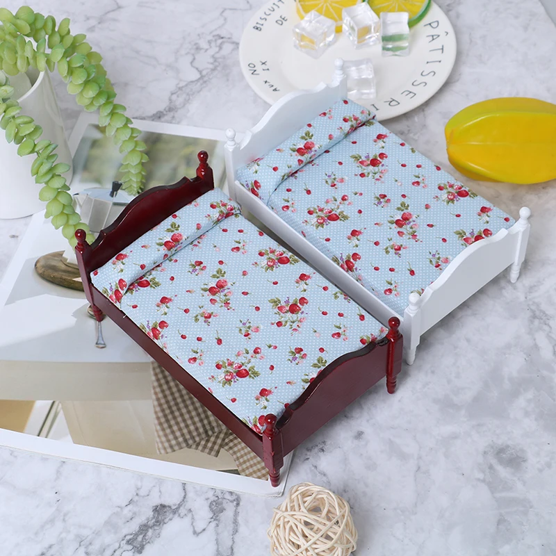 Новинка 112, миниатюрный матрас с цветочным рисунком и подушка, миниатюрный декор для кукольного домика, детская игрушка для ролевых игр, односпальная деревянная кровать