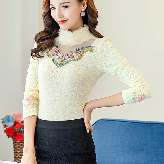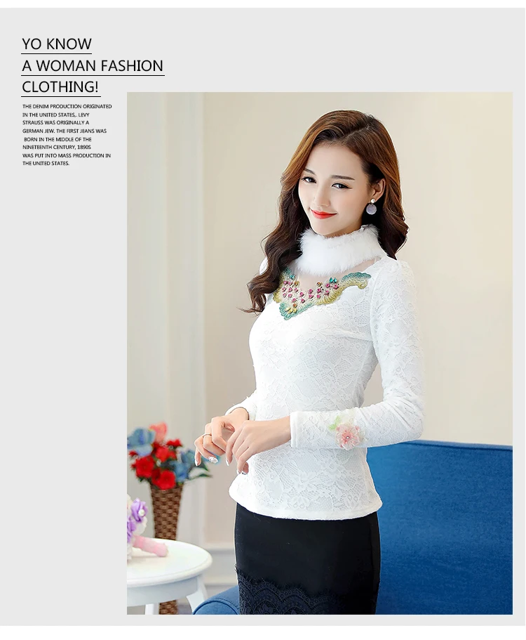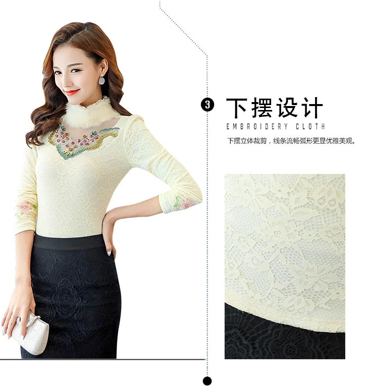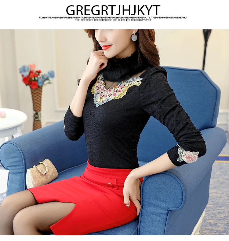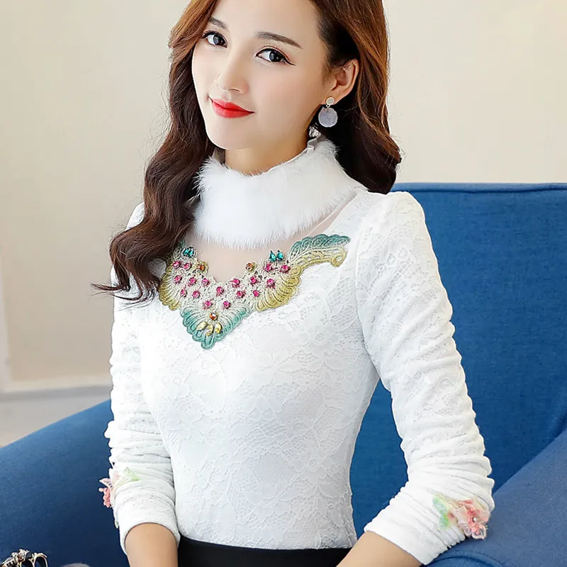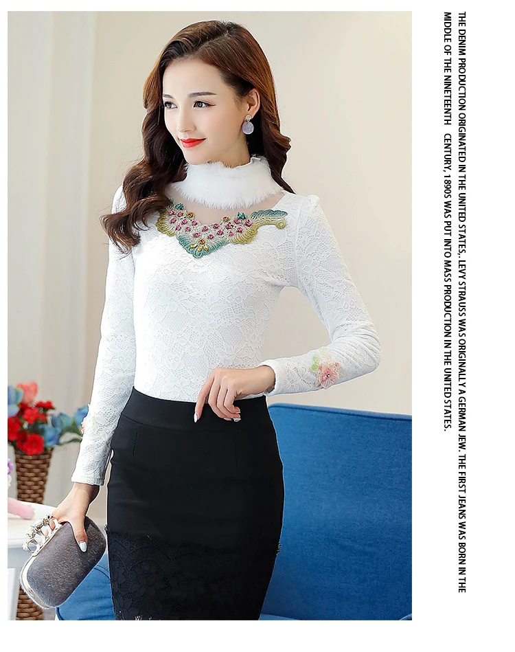Женская бархатная блузка с вышивкой, толстая кружевная блузка с воротником из кроличьего меха, ажурная, Осень-зима 2020