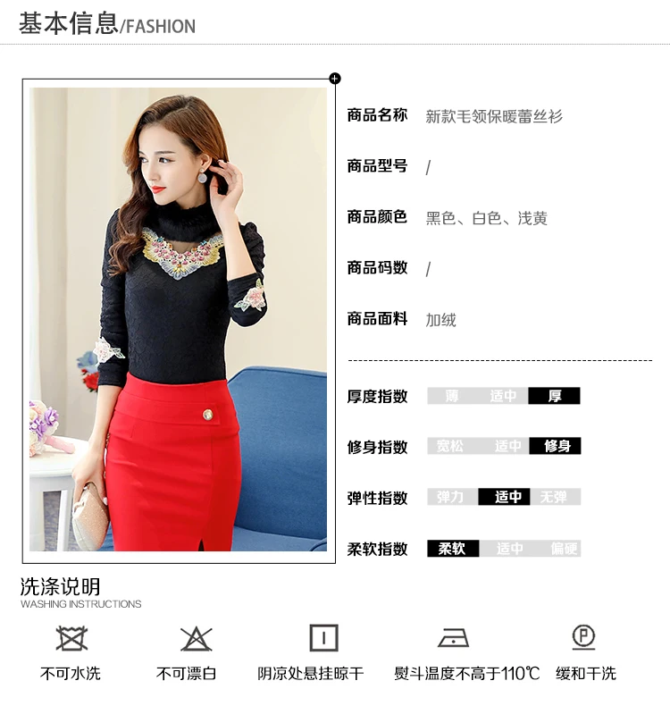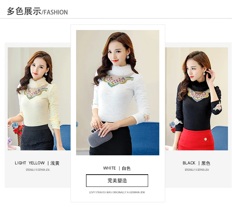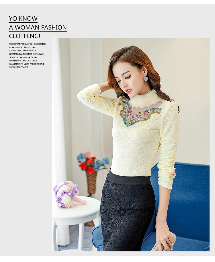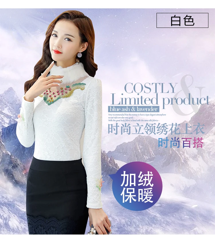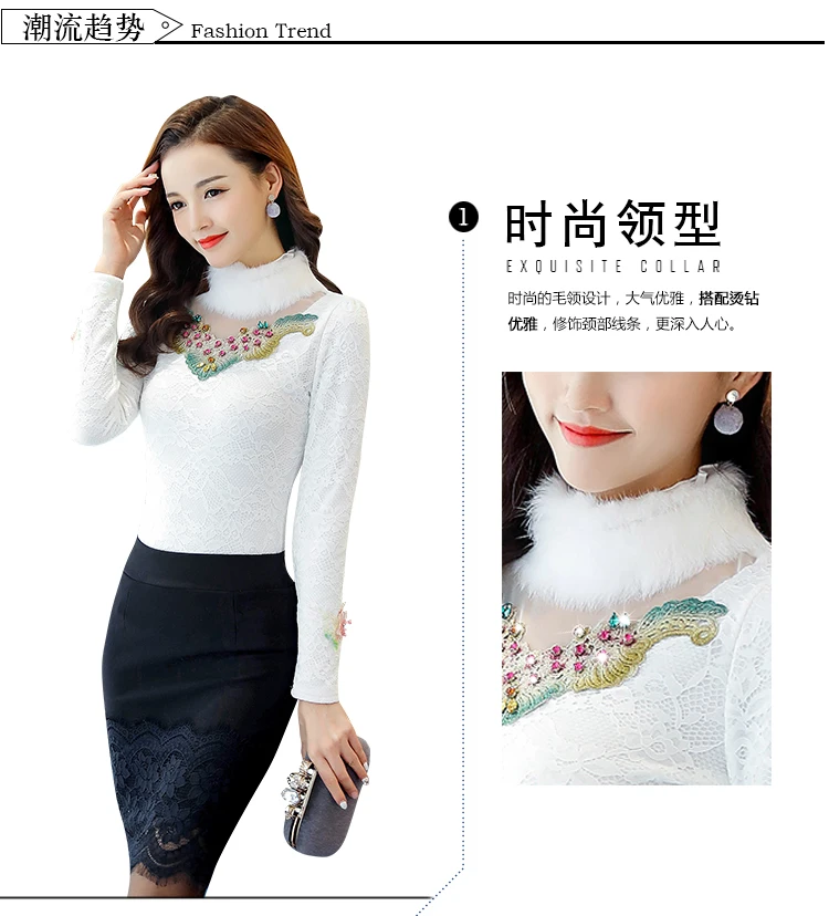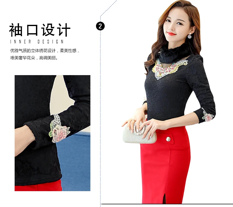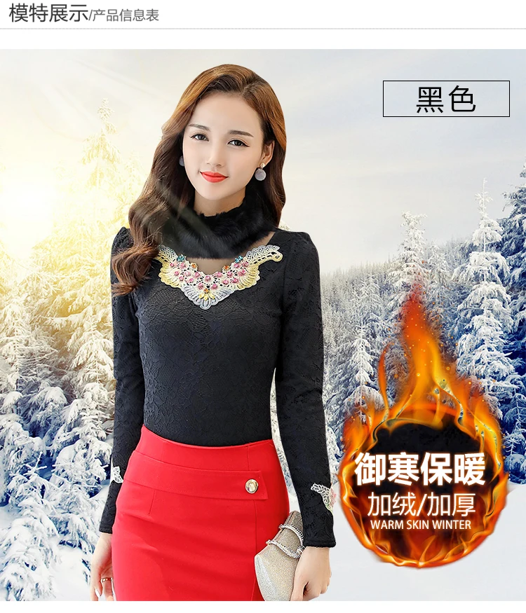 Женская бархатная блузка с вышивкой, толстая кружевная блузка с воротником из кроличьего меха, ажурная, Осень-зима 2020