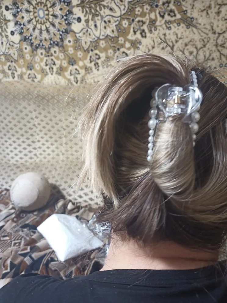 Заколка держит очень крепко, пластик немного желтоват, но на волосах это совершенно не заметно, смотрится шикарно. Хотела даже ещё заказать, но нет в наличии.(((