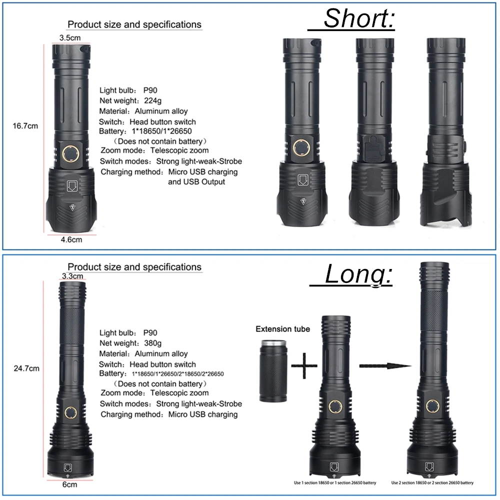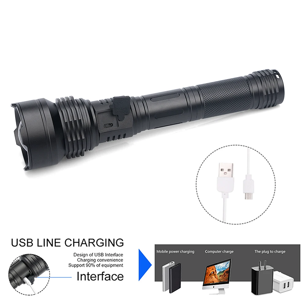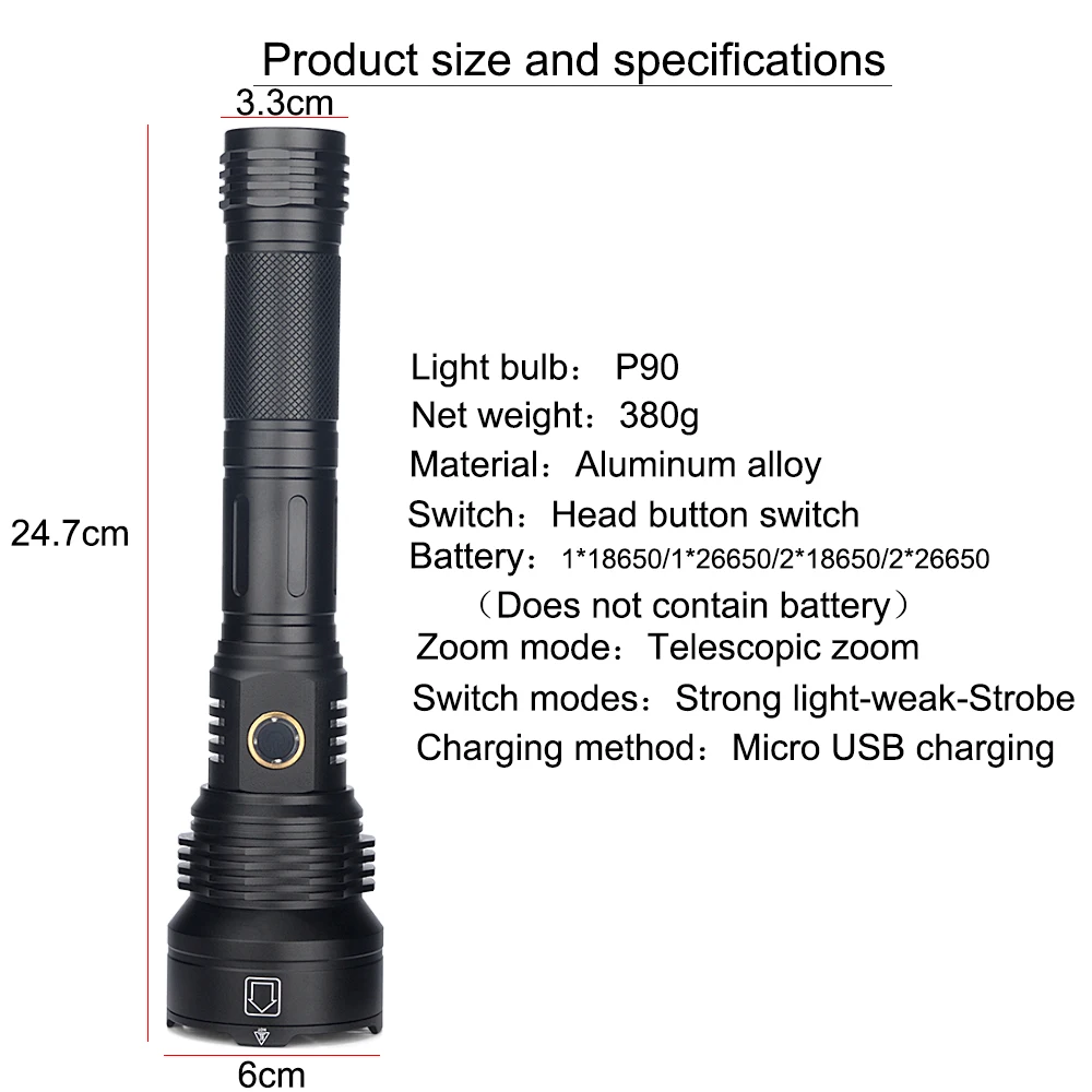 * Мощный светодиодный фонарик с использованием лампы XHP90.2 светодиодный * Увеличьте 2*18650 или 2*26650 аккумуляторный отсек, чтобы увеличить время работы (Длинная модель). * Дисплей емкости аккумулятора, телескопический зум * Micro usb для компьютера USB, Автомобильный USB, USB зарядный разъем, зарядный фонарик * Изготовлен из авиационного алюминиевого сплава прочный HAIII военный класс Жесткий анодированный * Водонепроницаемый в соответствии с IPX-6, водостойкий, может использоваться в дождливую погоду, но не может положить его в воду * Подходит для работы, охоты, альпинизма, рыбалки, кемпинга и активного отдыха и т. д.