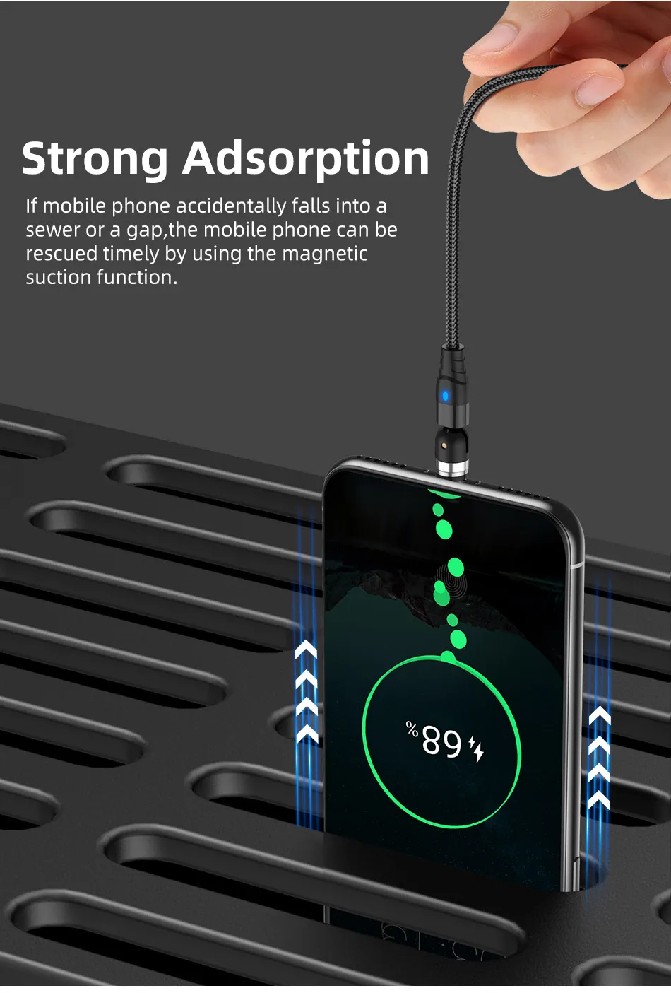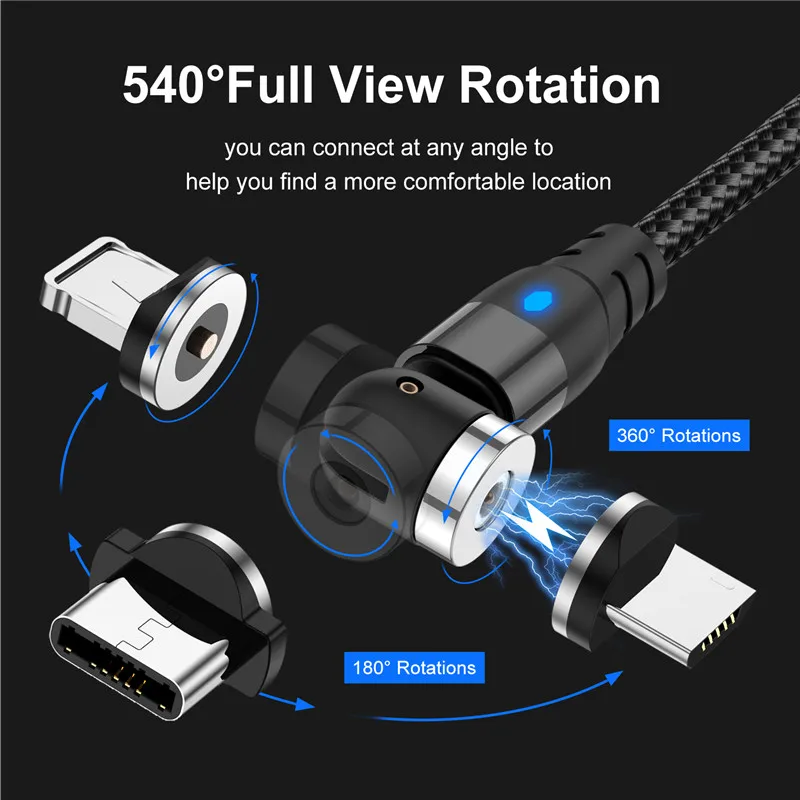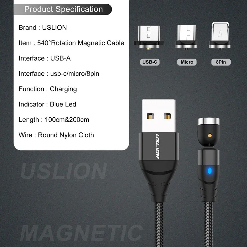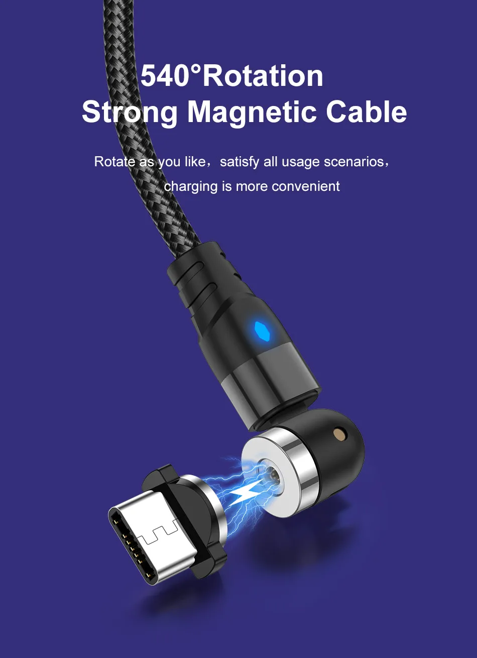 Магнитный кабель USLION Micro USB Type-C, вращающийся на 540 градусов, для iPhone11, Xiaomi, Samsung