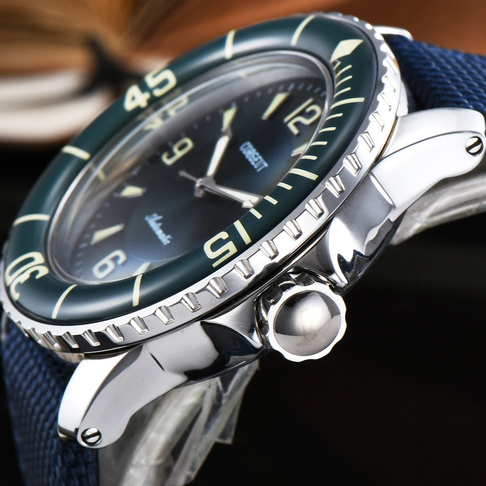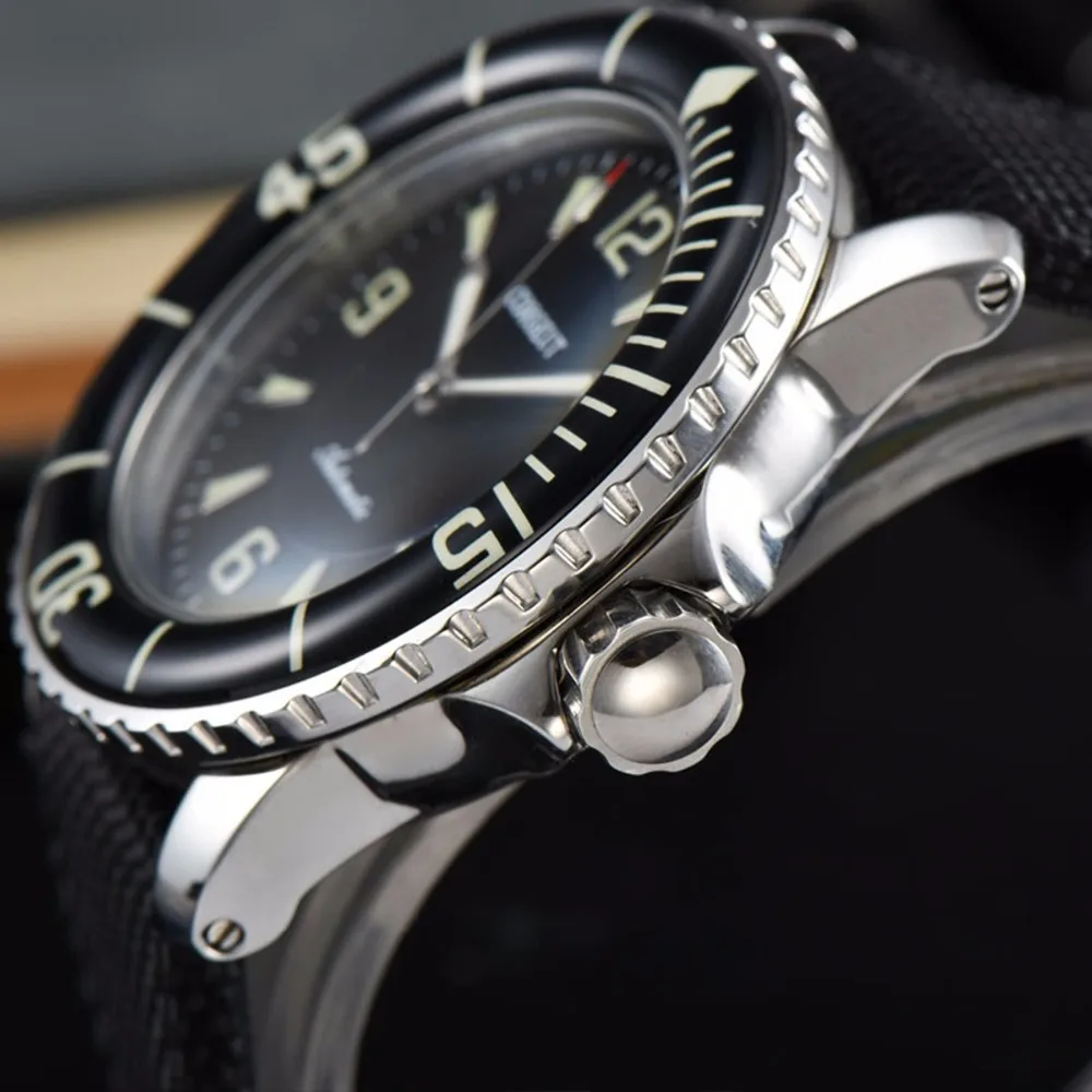Бренд: corgриста Механизм: Чайка 1612 механизм Механизм miyota 8215 Материал корпуса: полированный корпус из нержавеющей стали 316L Размер Чехла: 45 мм без короны Чехол Thickiness: 15 мм твердая задняя крышка. Цвет циферблата: зеленый/черный циферблат Ремешок: 23 мм смешанная ткань и кожаный ремешок с обычной пряжкой Тан. Стекло: специальное минеральное стекло с защитой от царапин Водонепроницаемость: 5 атм Светящийся: суперзеленый светящийся