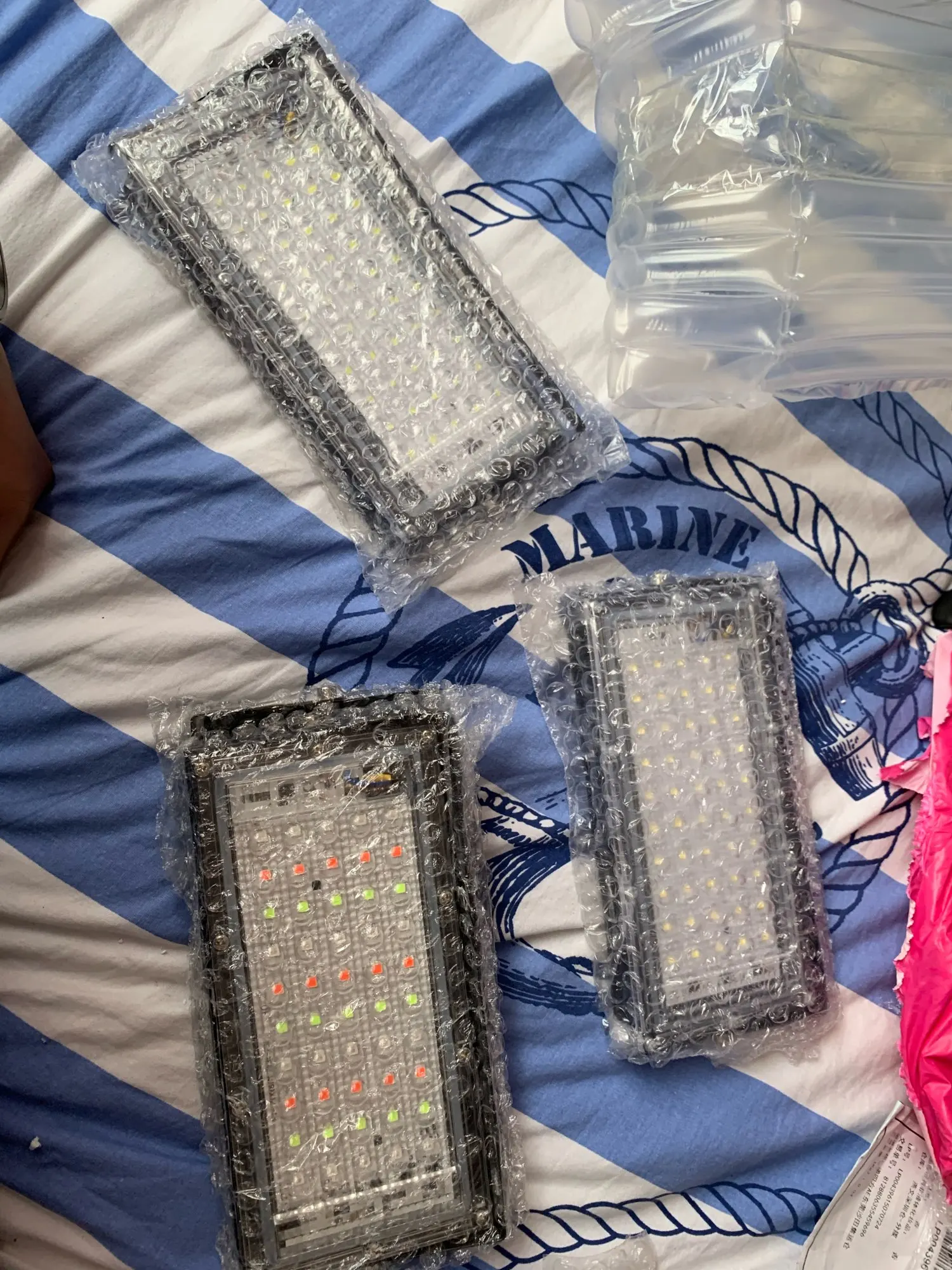 Из трех цветовых стержней RGB, они поставляются с Четырьмя синими, но красными и зелеными только с тремя, поэтому они выдаются в соответствии с цветом, который вы выбираете, кроме того, два пульта дистанционного управления работали только один для меня, и светодиоды остаются крепко включенными, хотя вы отключаете напряжение.