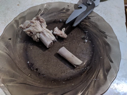 Ножницы качественные. но обратите внимание на такие аспекты... 1 они тяжёлые...примерно раза в два чем обычные. 2 режущая часть далеко находится они ручки и не удобно управлять. и она короче чем у обычных. 3 они открываются на маленький угол... точнее так происходит если открыть их пальцами одной руки, соответственно ими удобно резать что то не толстое. а кости именно толстые и как сможете догадаться это не очень удобно. вообщем единственный их плюс это прочность.