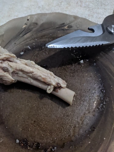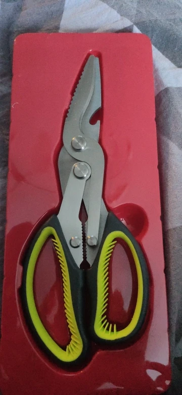 Хорошие ножницы. Неплохо упакованы, не люфтят. Брал маме: после резки рыбы и курицы осталась очень довольна. На фото сам разрезал кость с ножки бройлера -- вообще без напряга, словно пластилин. Пока оставляют хорошее впечатление, посмотрим, как будет держаться заточка и не будет ли коррозии. Дополню отзыв спустя месяцок.